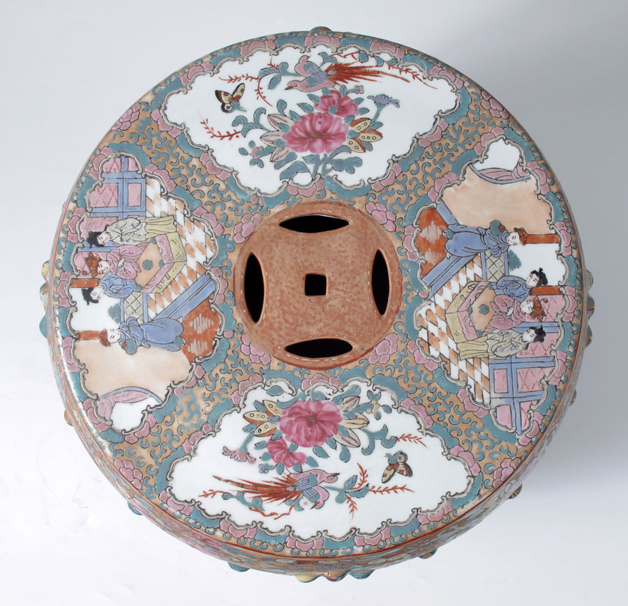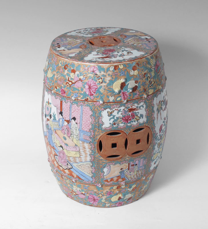 ROSE MEDALLION GARDEN SEAT: 18 1/4'' h. x 14 1/2'' dia. at the widest part.