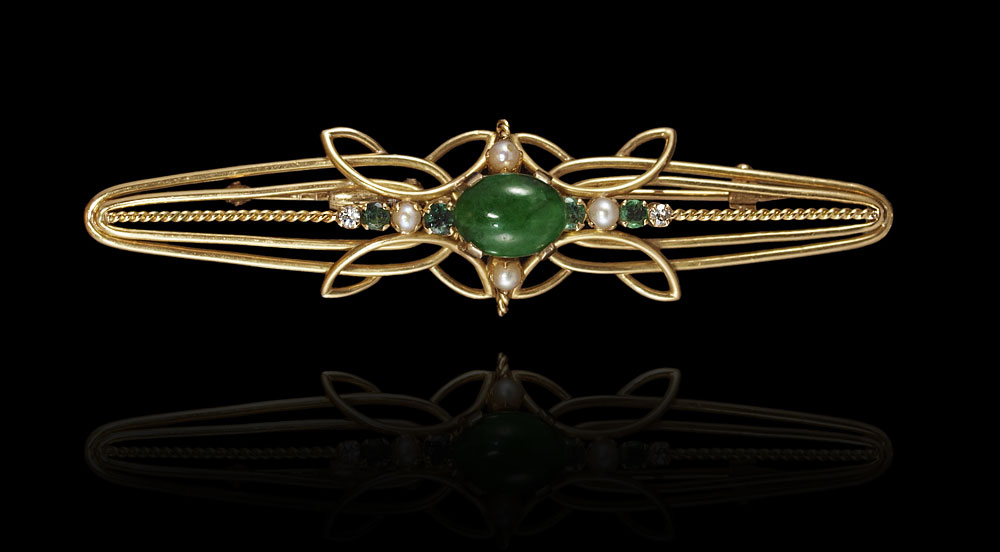 18K JADE, EMERALD AND DIAMOND BROOCH: 18K yellow gold brooch contains one 12.00 x 9.00 mm cabochon cut piece of jadeite jade. Four round mixed cut emeralds. Weight: .30 Ct. Approx. Two round single cut diamonds. Weight: .08 Ct. Approx. Two 3.00 mm seed pearls. All gemstones are prong set. Unidentified hallmarks. Weight: 15.7 grams. Length: 3.5''