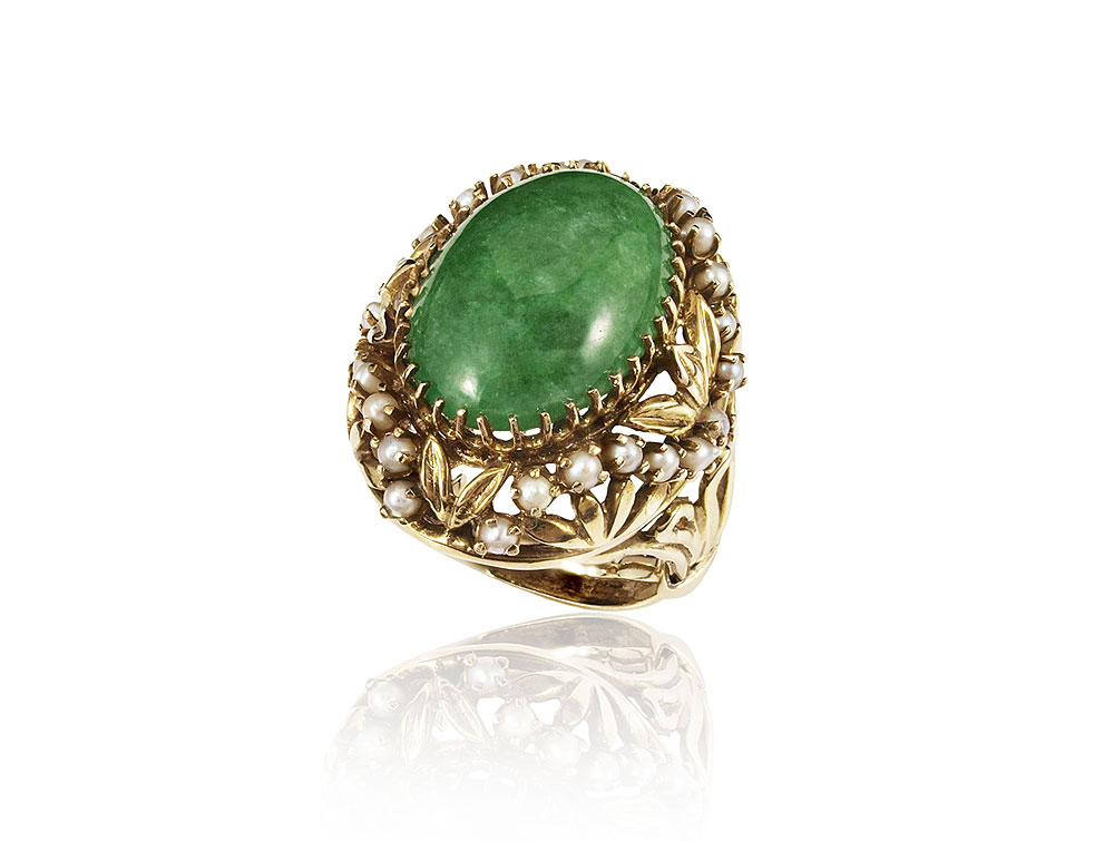 JADE AND PEARL RING: Ornate 14K yellow gold ring centers one 18.00 x 14.00 mm cabochon cut piece of nephrite jade. The seed pearls are 2.00 mm. The jade and pearls are prong set. Weight: 10.9 grams