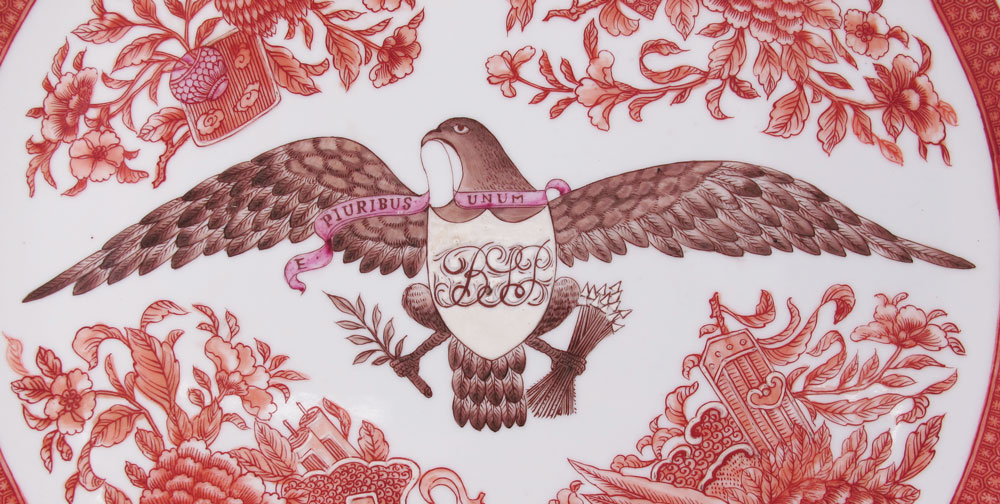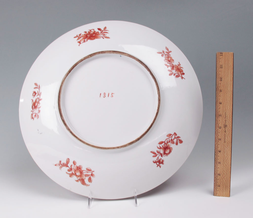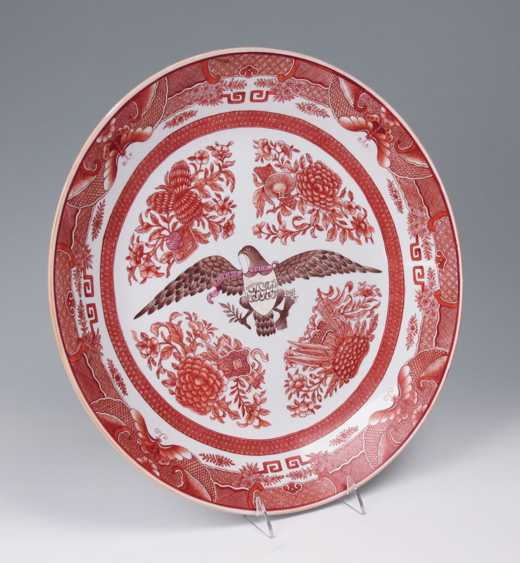 CHINESE EXPORT AMERICAN EAGLE MOTIF CHARGER: Porcelain charger with iron red oriental motifs, spread wing American eagle center with E Pluribus Unum motto banner and monogrammed on shield. Underglaze mark of 1815 on base. 16 1/4'' dia.