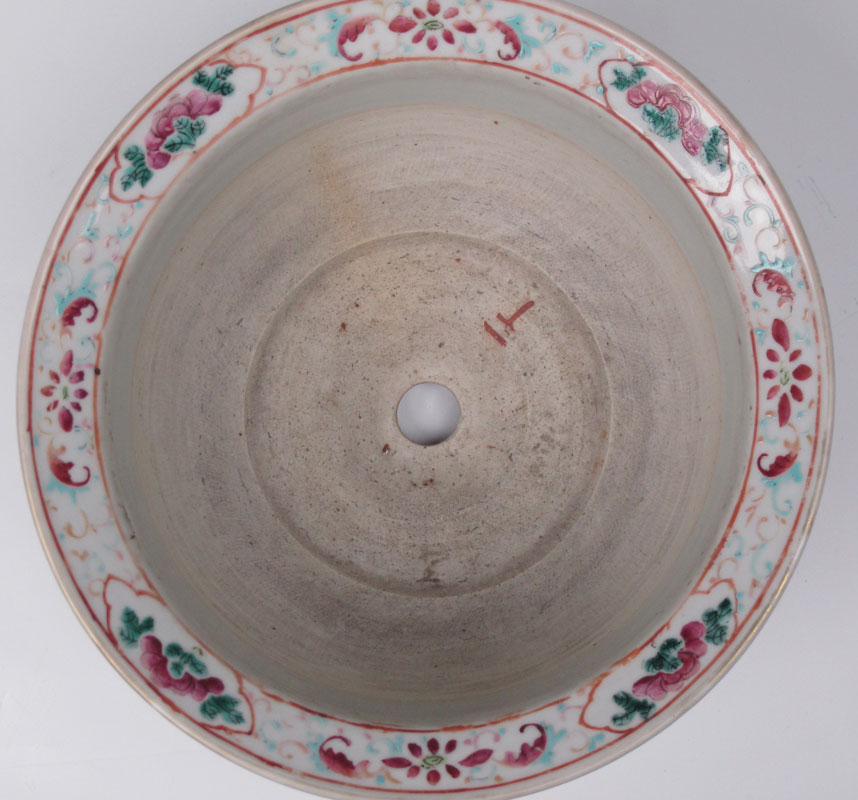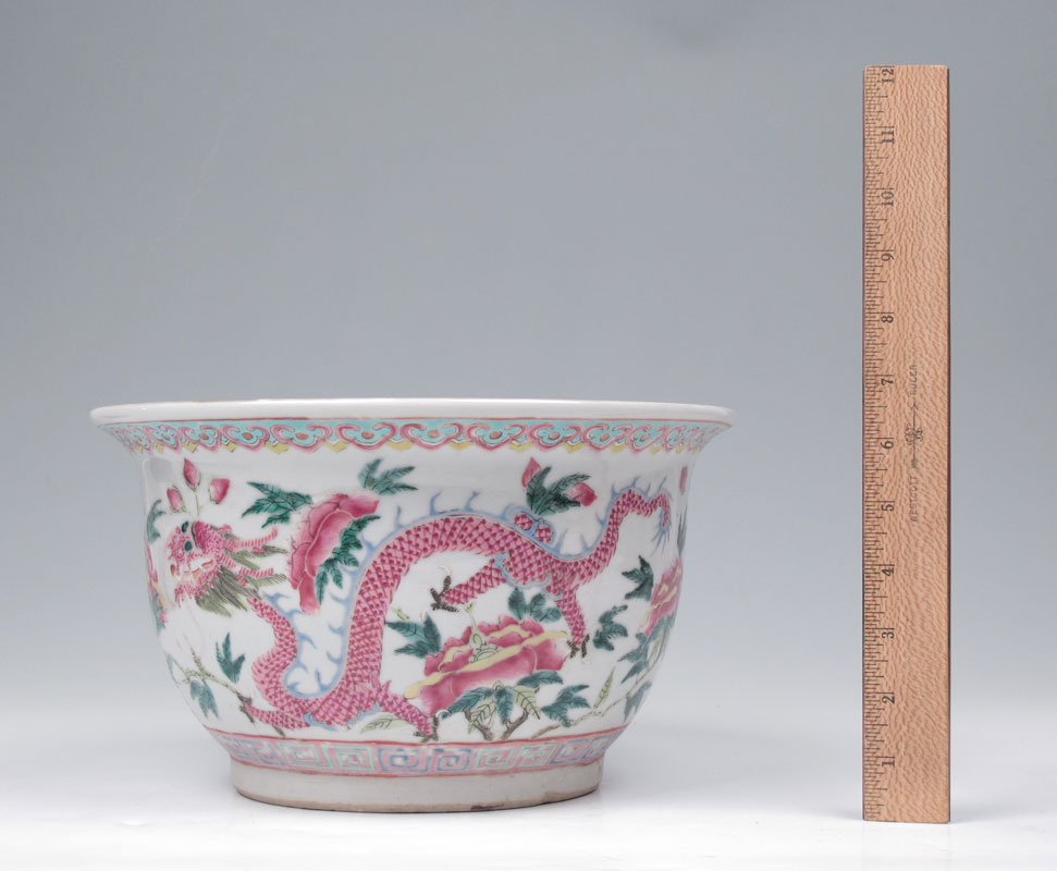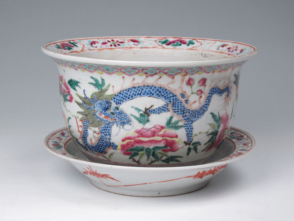 LATE 19TH CENTURY CHINESE PLANTER AND UNDERPLATE: Planter with dragons and floral motif, mark interior of planter, 6 1/2'' h. x 11 /4''. Sold with underplate with floral motif rim and bamboo motif sides, 2 1/4'' h. x 11 1/4'' dia.
