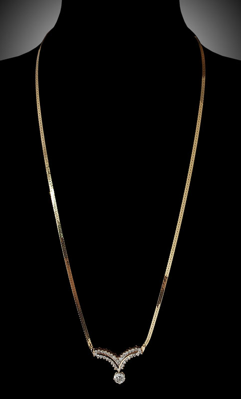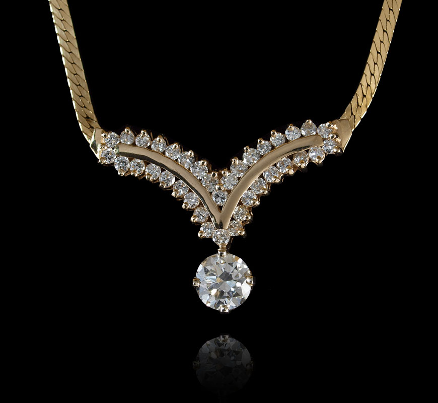 3.31 CTW DIAMOND NECKLACE WITH A 1.21 CT CENTER: 14K yellow gold necklace contains one round transitional brilliant cut diamond, approx. 1.21 Ct., rated VS2 in clarity and I in color. There are an additional 36 round brilliant cut diamonds totaling approx. 1.10 Ct., averaging VS in clarity and H-I in color. The diamonds are prong and half channel set. Herringbone chain with barrel clasp and figure eight safety clasp. Weight: 13.7 grams. Length: 20''