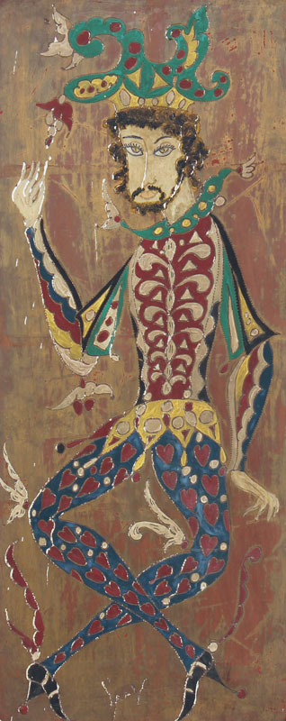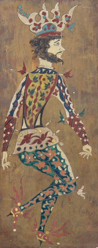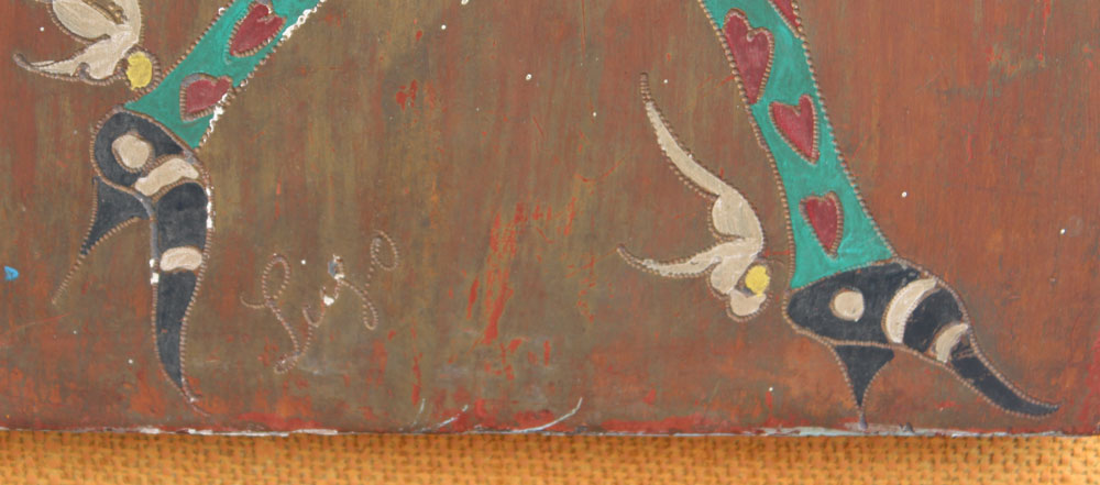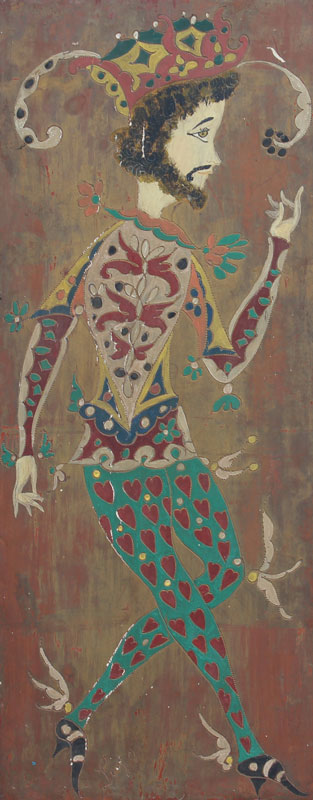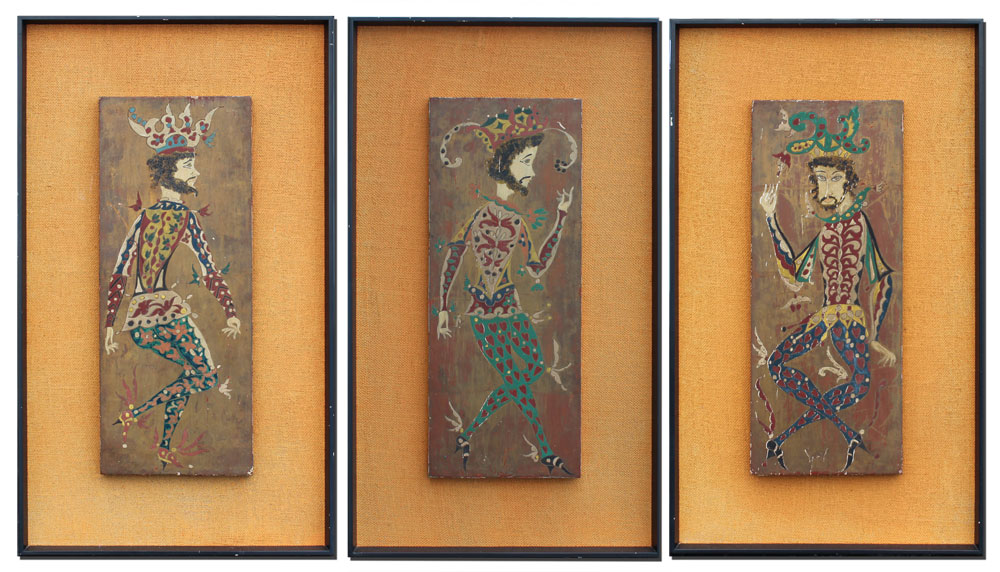 THREE MODERNIST OIL ON WOOD PANEL PAINTINGS OF JESTERS: 23 1/2'' x 9 1/2'', illegibly signed Lugo?, circa 1950, affixed to period frames with fabric mats in worn condition, 34'' x 19 3/4''.