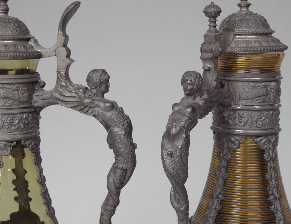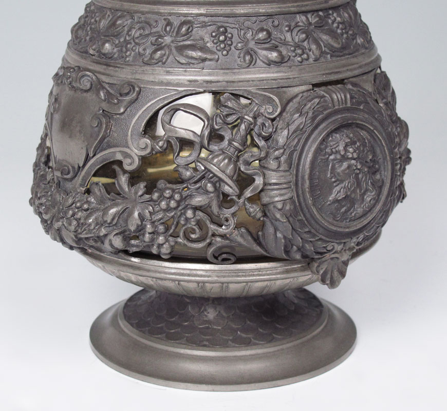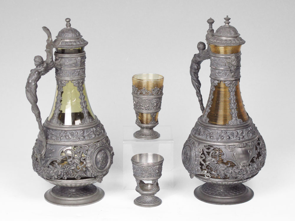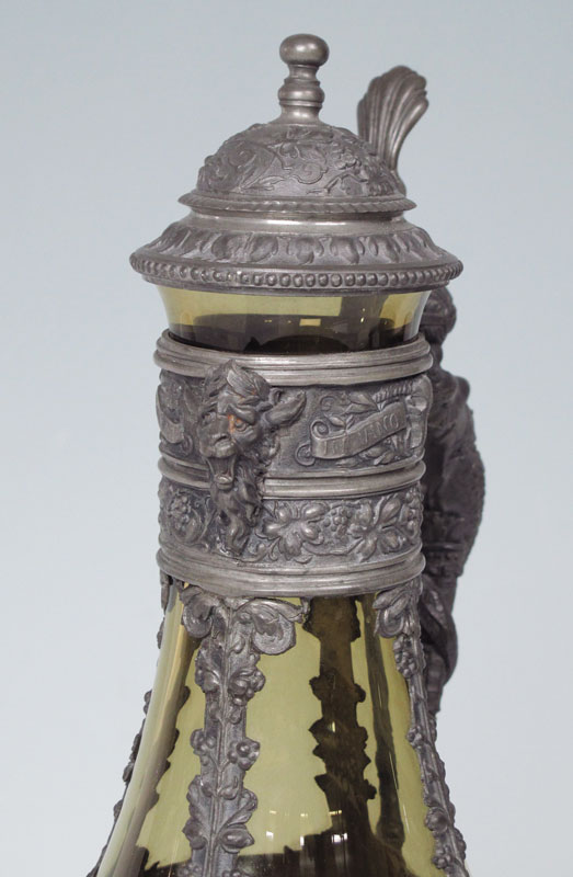 2 PIECE PEWTER OVERLAY FIGURAL WINE DECANTERS: Similar but not identical with pewter masquerons, figural handles and other emblements. One with threaded glass, other smooth glass. Each measures 14 1/2'' h. x 7'' dia. Sold with one complete cup with threaded glass, other missing glass insert.