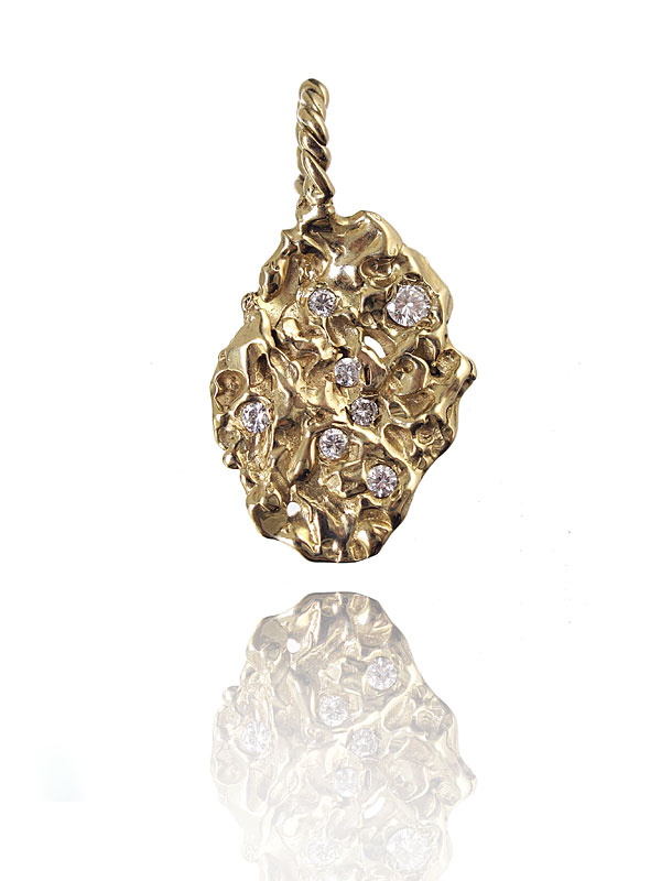 14K DIAMOND NUGGET PENDANT: 14K yellow gold nugget style pendant contains 7 round brilliant cut diamonds totaling approx. 1.00 Ct., averaging VS in clarity and G-H in color. The diamonds are deep set. Overall length 2''. Weight: 15.8 grams.