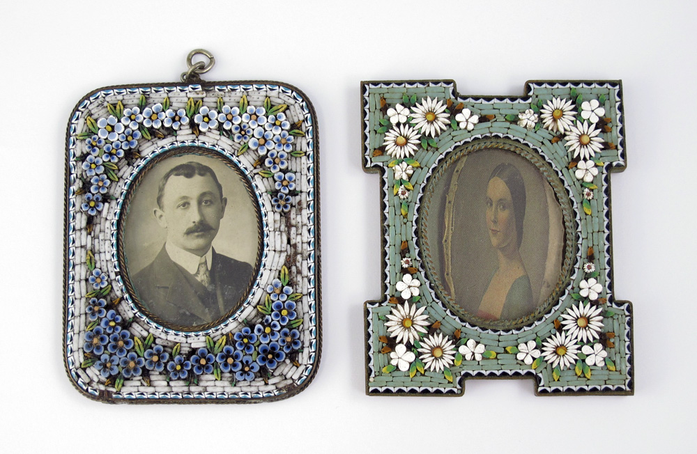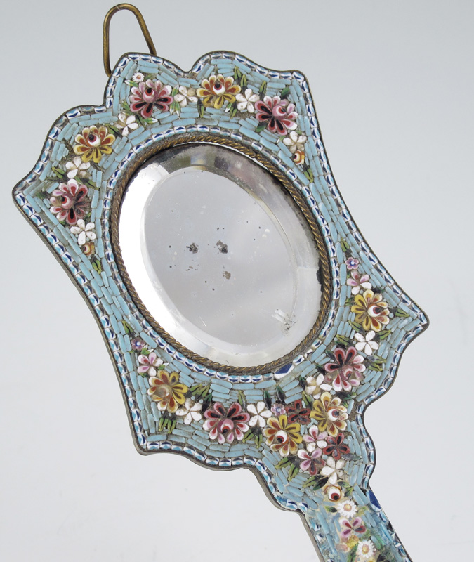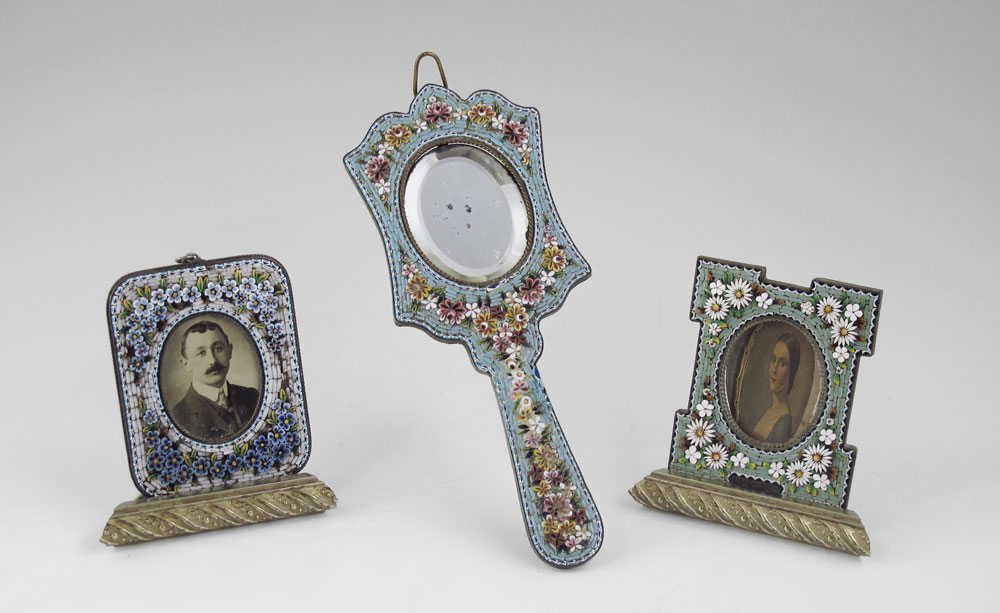3 PIECE ITALIAN MOSAIC FRAMES AND MIRROR: To include 1) Floral motif petite hand mirror with beveled mirror. 7 1/4'' l. x 2 7/8''. 2) Floral motif frame with rounded corners, 3 3/8'' x 2 1/2''. 3) Floral motif frame with shaped corners, missing back plate. 3 1/8'' x 2 1/2''.