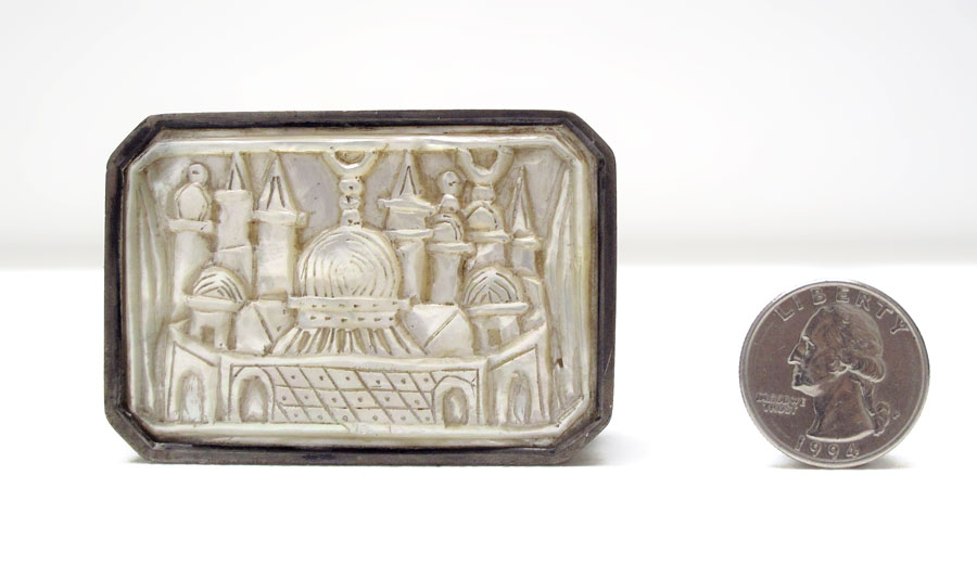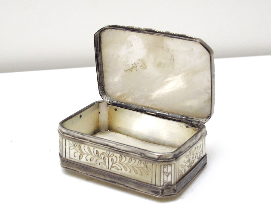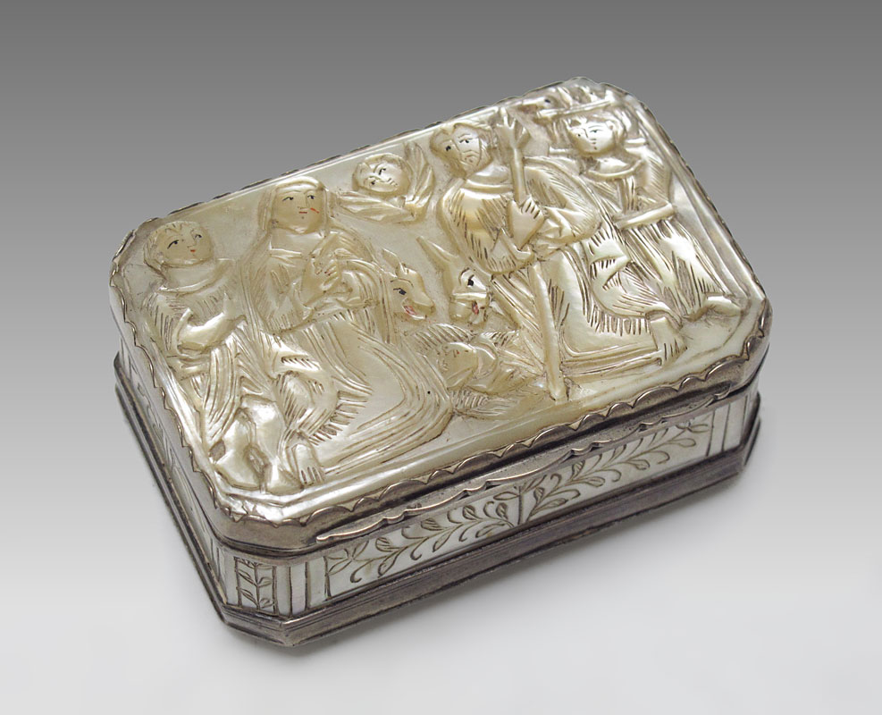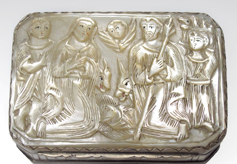 CONTINENTAL CARVED MOTHER OF PEARL SNUFF BOX: With carved hinged top scene of the birth of Christ, engraved foliate sides, carved base of a church or mosque. Most likely Russian, unmarked. 1 1/8'' h. x 2 5/8'' x 1 7/8''.