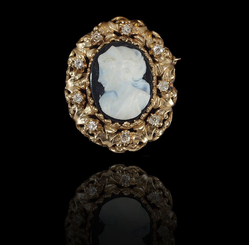 14K HARDSTONE CAMEO AND DIAMOND PENDANT / BROOCH: 14K yellow gold brooch/pendant centers one oval 20.00 x 10.00 mm hardstone cameo depicting a portrait. The cameo is framed by 9 round brilliant, old mine and early single cut diamonds totaling approx. .50 Ct. Rated SI-I1 in clarity and H-I in color. The cameo and diamonds are prong set. Bar pin closure and fixed bail Length 1 3/8''. Weight: 11.1 grams.