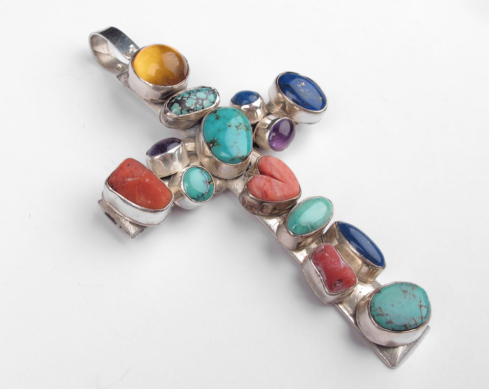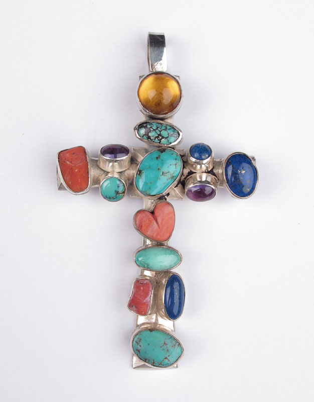LARGE STERLING GEMSTONE CROSS: Assorted pink, blue, purple and gold gemstones bezel set in 4 1/4'' x 2 1/2'' cross pendant. Stamped Sterling on back, stones possibly include coral, lapis, turquoise, amethyst, and amber.
