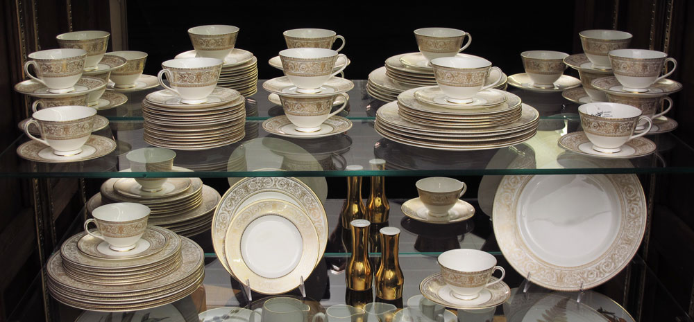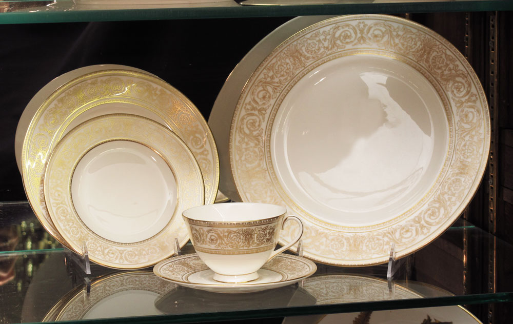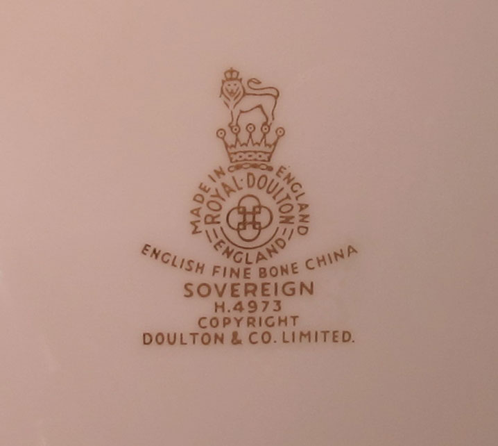 ROYAL DOULTON CHINA SERVICE ''GOLD SOVEREIGN'': 62 pieces to include 12 dinner plates (10 1/2''), 12 salad plates, 14 bread plates, 12 cups and 12 saucers. Included are the Royal Worcester salt and pepper shakers.