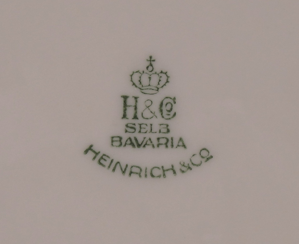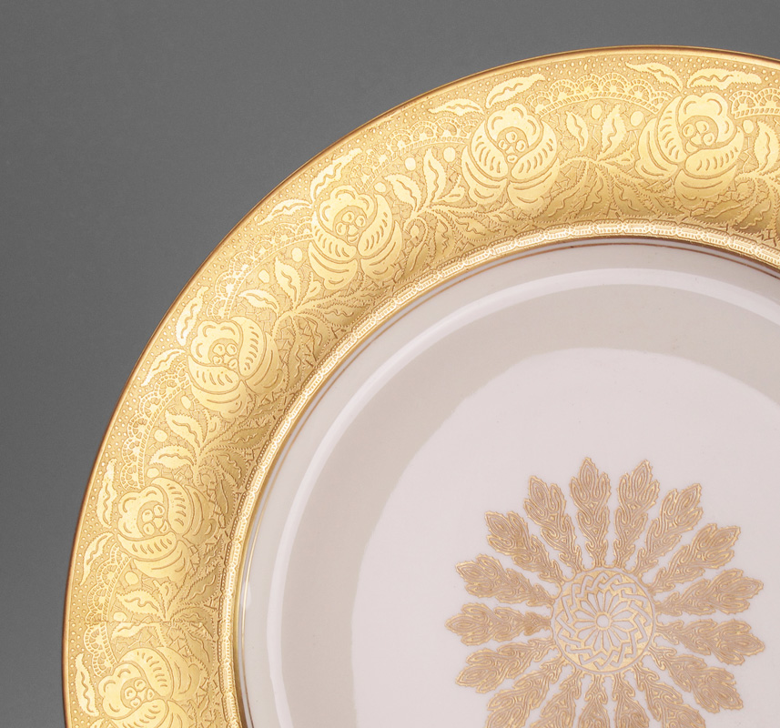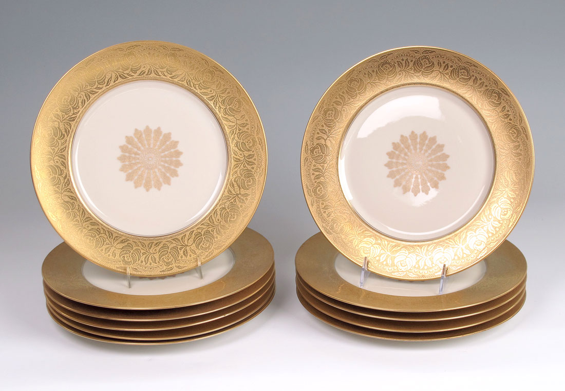 HEINRICH FINE CHINA SERVICE PLATES: Wide embossed gold rim with central medallion. Approx. 11'' dia.