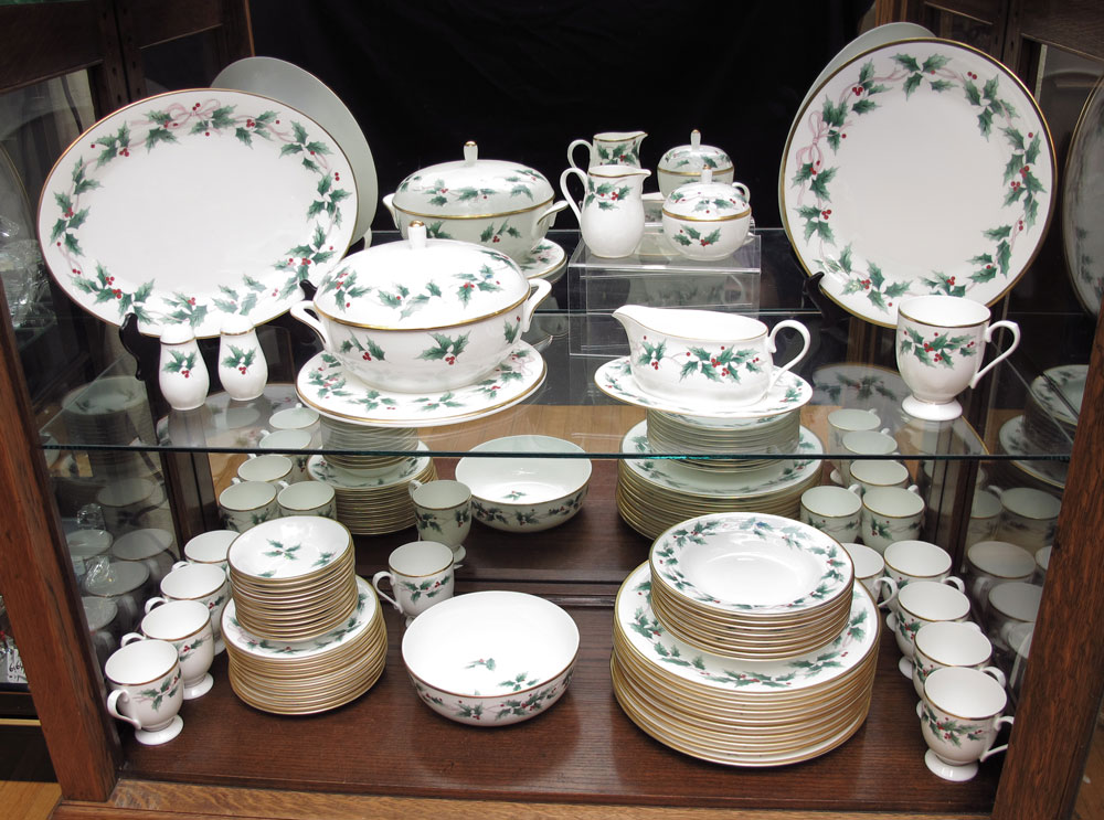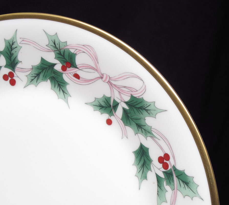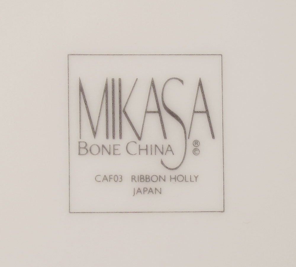 MIKASA ''RIBBON HOLLY'' FINE BONE CHRISTMAS CHINA: Approx. 62 pieces to include 12 chop size dinner plates (12''), 11 salad plates (7 5/8''), 8 soup bowls, 12 dessert bowls, 12 footed mugs, covered vegetable bowl, open vegetable bowl, gravy, underplate to gravy, salt & pepper, covered sugar, creamer, cake plate ( 10 1/2''), and the 14'' platter.