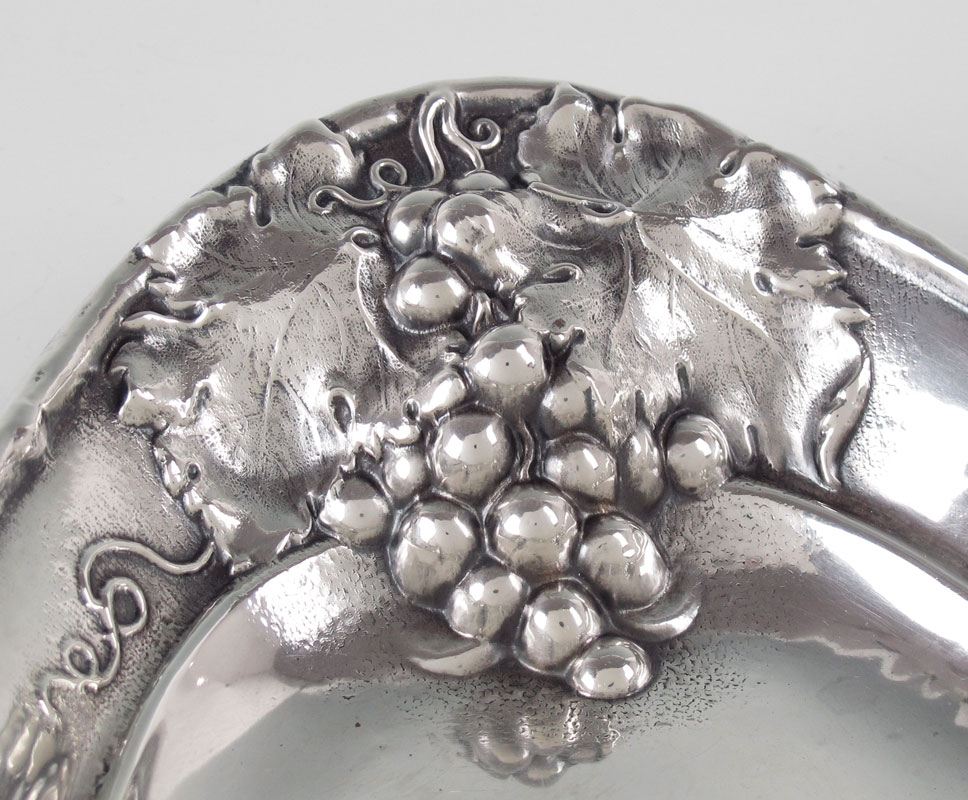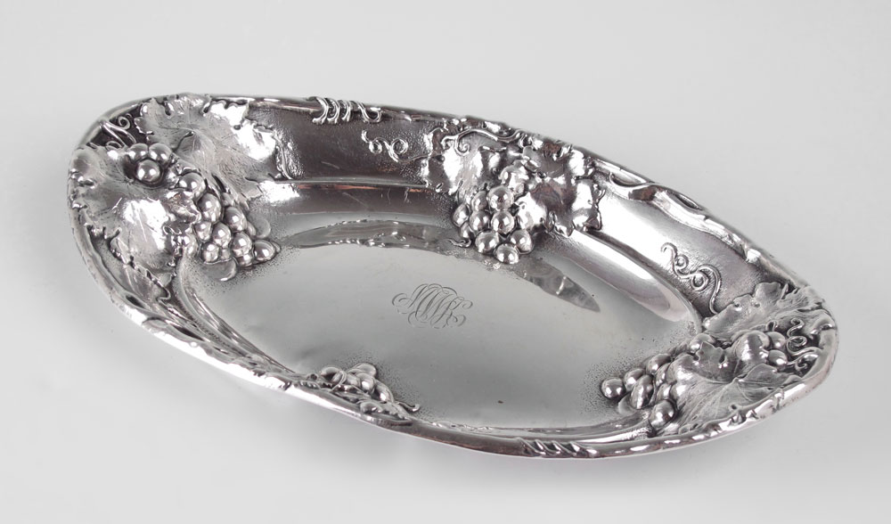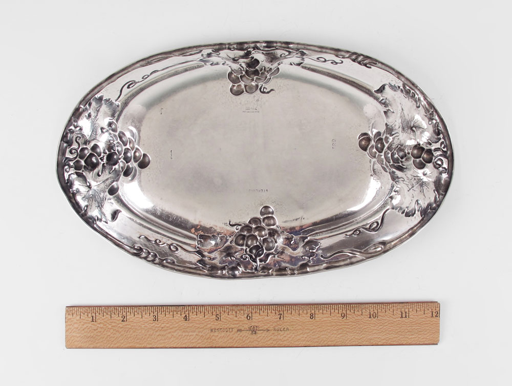 MAUSER STERLING ART NOUVEAU GRAPE VINE TRAY: In a grape vine motif, marked with Mauser Manufacturing Co. hallmark, Sterling 925/1000 fine, Pat'd Dec 22, 1903. Monogrammed. 1 1/2'' h. x 13'' x 7 3/4''. Approx. 7.9 troy oz.
