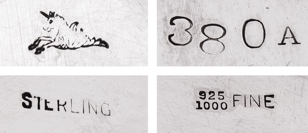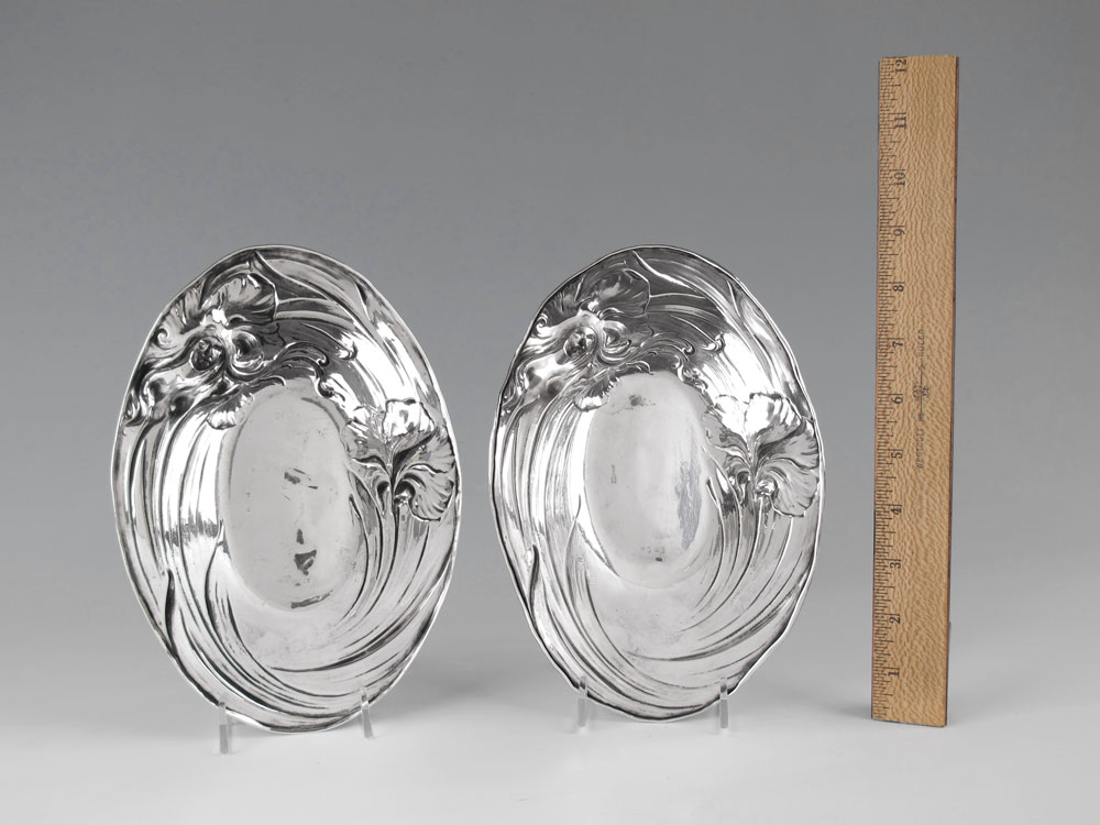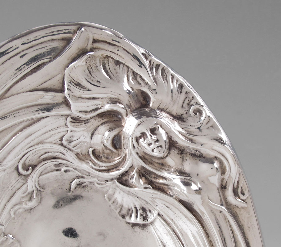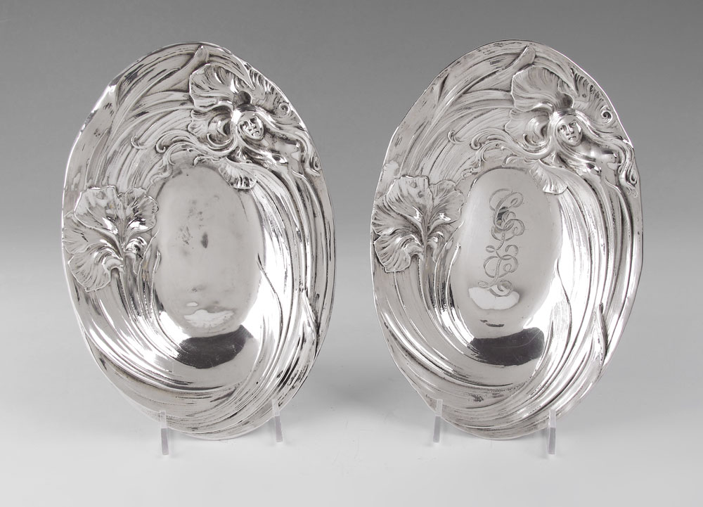 PAIR MAUSER STERLING ART NOUVEAU FIGURAL TRAYS: Each featuring elongated female figures to the right, pattern number 380A. One monogrammed CLL. 9 1/4'' x 6 1/4''. Approx. 8 troy oz.