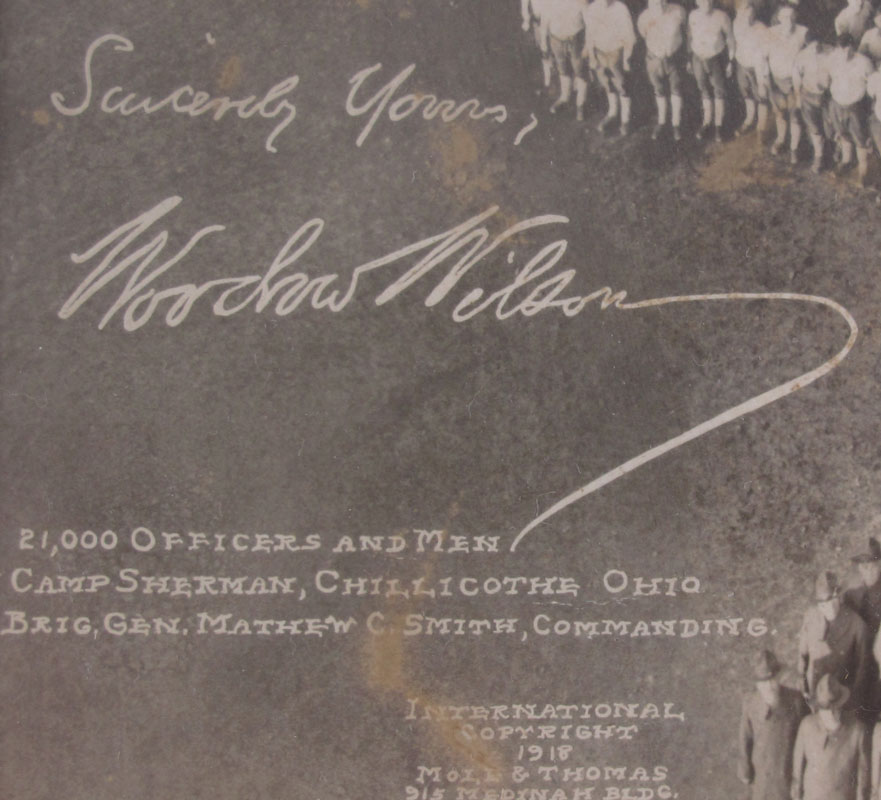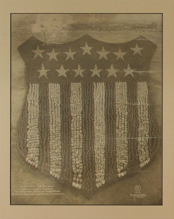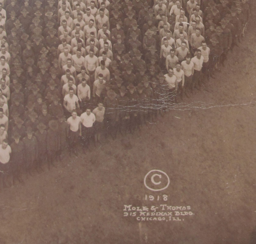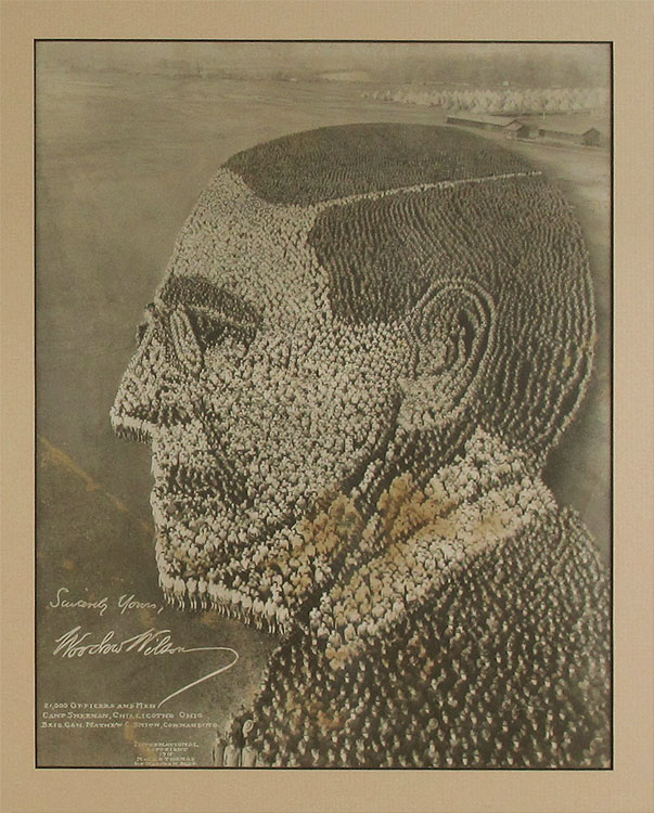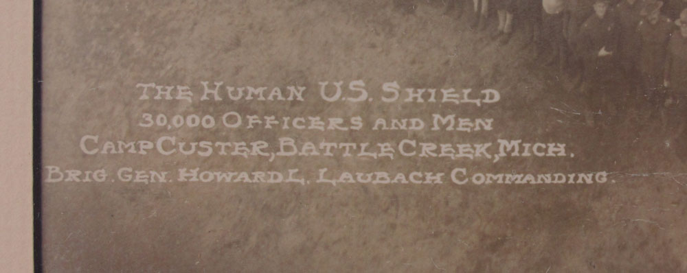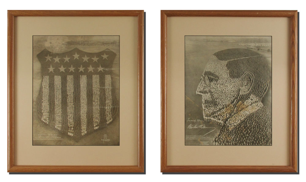 2 PIECE MOLE & THOMAS SILVER GELATIN PHOTOGRAPHS: To include 1) ''The Human US Shield, 30,000 Officers and Men, Camp Custer, Battle Creek, Mich. Brig. Gen. Howard. L. Laubach Commanding.'' Copyright 1918 Mole & Thomas. Sight size 13'' x 10 1/4'', framed 19 1/2'' x 16 1/4''. 2) ''Woodrow Wilson, 21,000 Officers and Men, Camp Sherman Chillicothe, Ohio, Brig. General Mathew C. Smith, Commanding''. International Copyright 1918 Mole & Thomas. Sight size 13'' x 10 1/4'', framed 19 1/2'' x 16 1/4''.