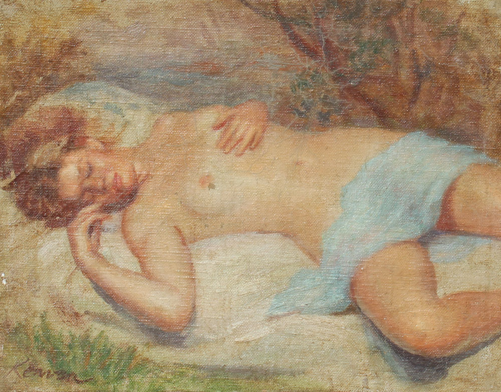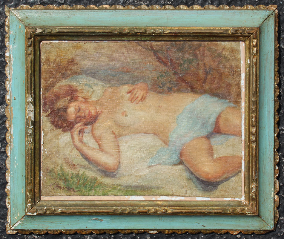 GOOD SIGNED NUDE ILLUSTRATION: Kervan?, Oil/Canvas/Board, 7 1/4'' x 9 1/4'', signed lower left, painted frame with wear, 11'' x 13''.