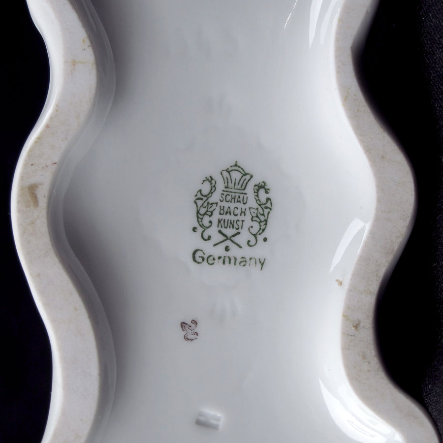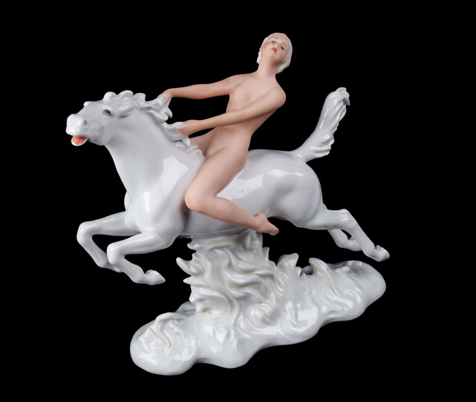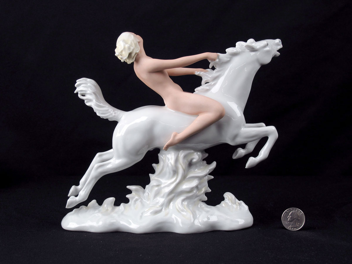 SCHAUBACH KUNST NUDE PORCELAIN FIGURE ON HORSE: Figure of a nude woman on white horse. Schaubach Kunst under glaze mark. 8'' h. x 9'' x 3''.