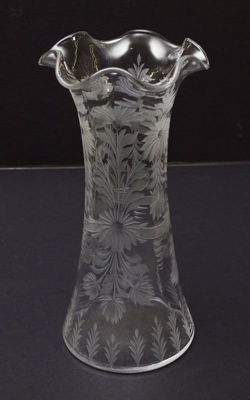 LIBBY AMERICAN BRILLIANT CUT GLASS VASE: Floral motif, signed on base. 10'' h. x 4 1/2''.