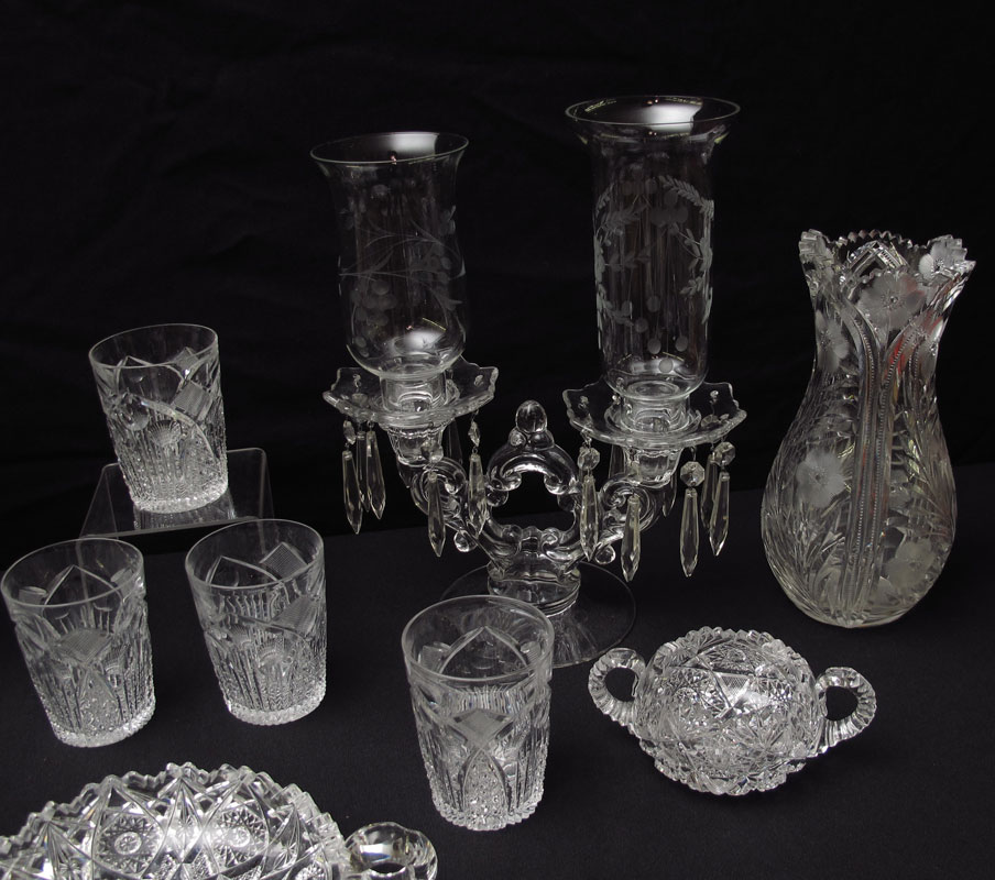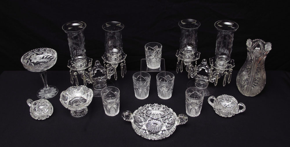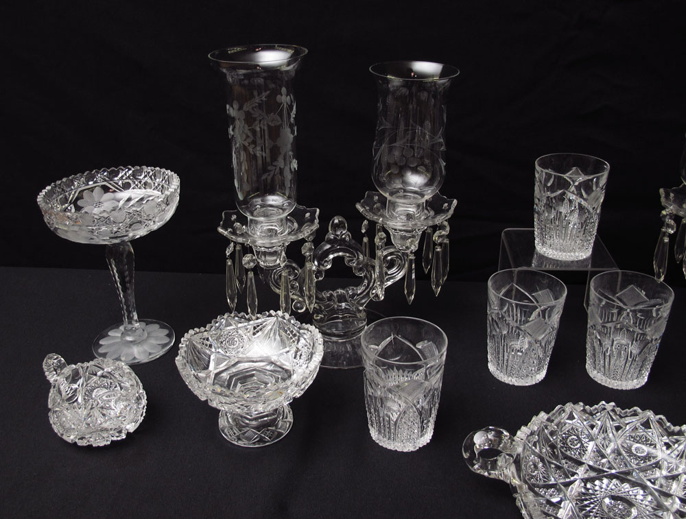 AMERICAN BRILLIANT CUT AND ELEGANT GLASS: Group of American Brilliant glass include the 9 1/2'' vase, 5 tumblers, a 5'' dia. compote, a 7 3/4'' tall compote, creamer and sugar set, and a double handle nappy, 10'' dia. The Elegant depression glass two light candle holders have bobeche and prisms. The shade are two different patterns and sizes.