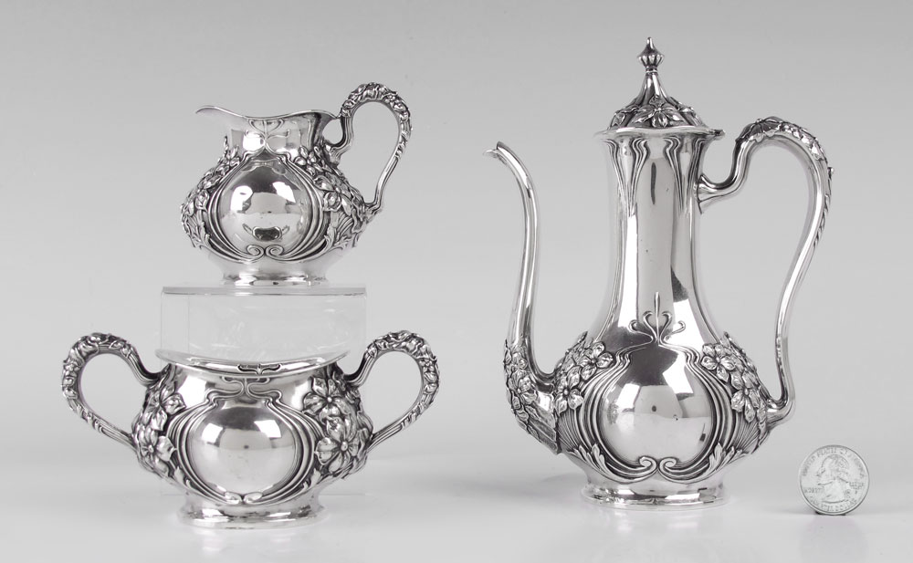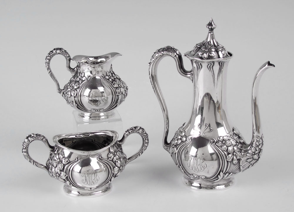 WEBSTER 3 PIECE ART NOUVEAU STERLING CHOCOLATE SET: Repousse floral motif by Webster Co. to include chocolate pot (6 3/4'' h.), creamer (3 1/4'' h.), sugar (2 1/2''). Monogrammed. Approx. 9 troy oz. CONDITION: Note dings and wear appropriate for age.