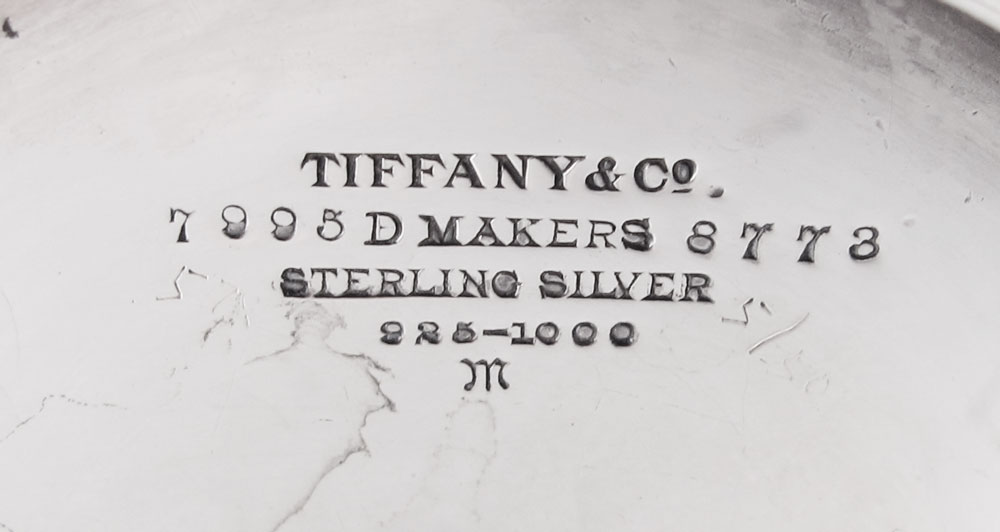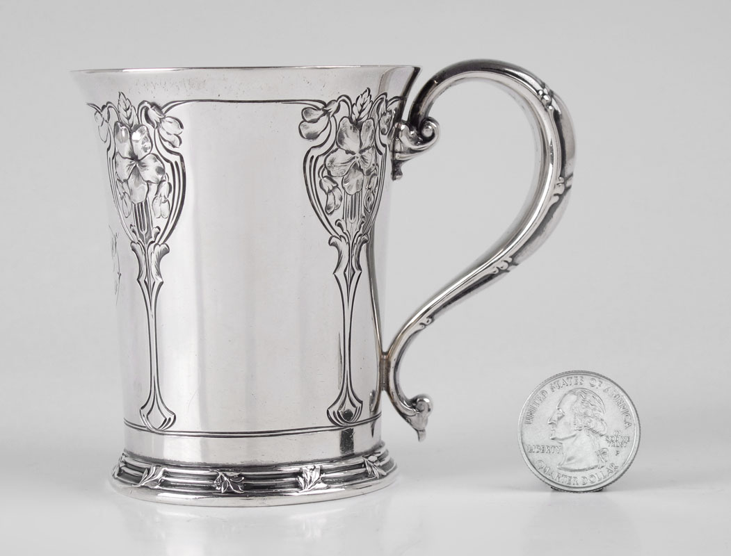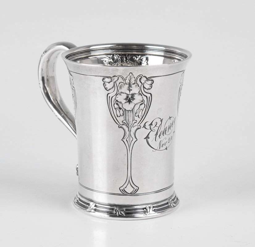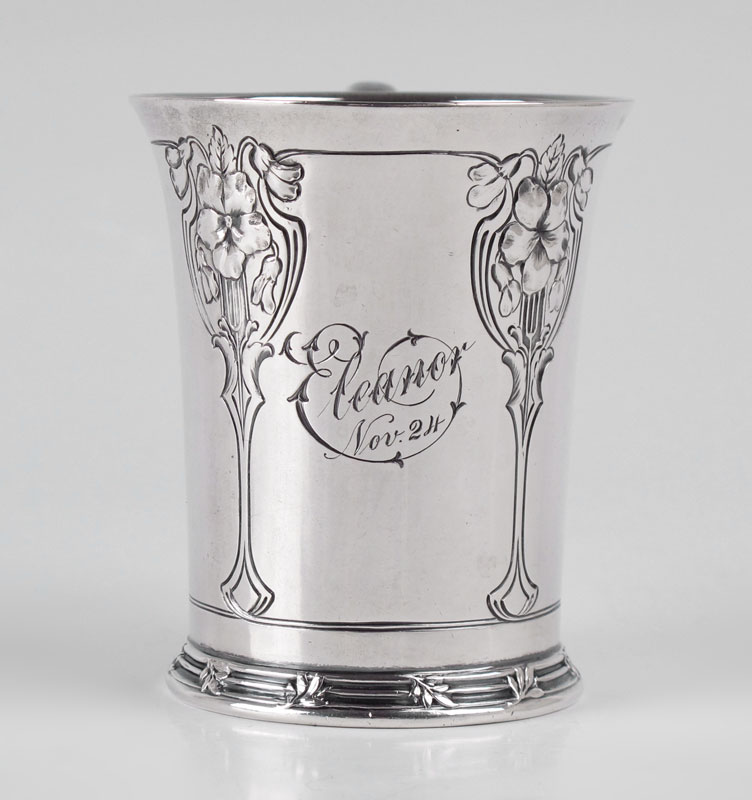 TIFFANY & CO. TRANSITIONAL PERIOD MUG: Repousse stylized floral motif, transitional period of art nouveau to art deco. Engraved Eleanor Nov. 24, marked Tiffany & Co. 7995 D Makers 8778 Sterling Silver 925-1000 M. 3 3/8'' h. x 4''. Approx. 5.4 troy oz.