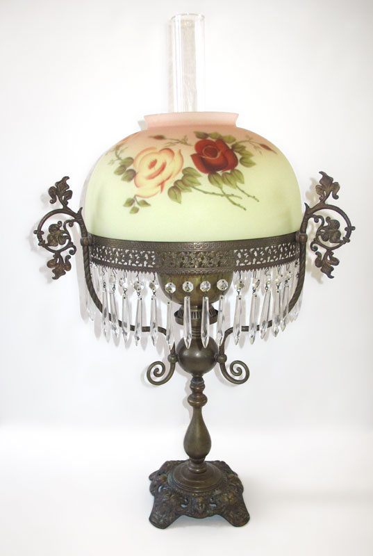 HAND PAINTED SHADE OIL LAMP: Cast metal base with masquerons, shade supports with leaves, pierced floral rim with crystal prisms. Hand painted shade with rose motif. Overall 33'' h. x 18 1/2'', shade 7'' x 14''