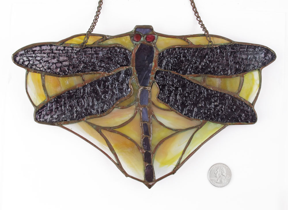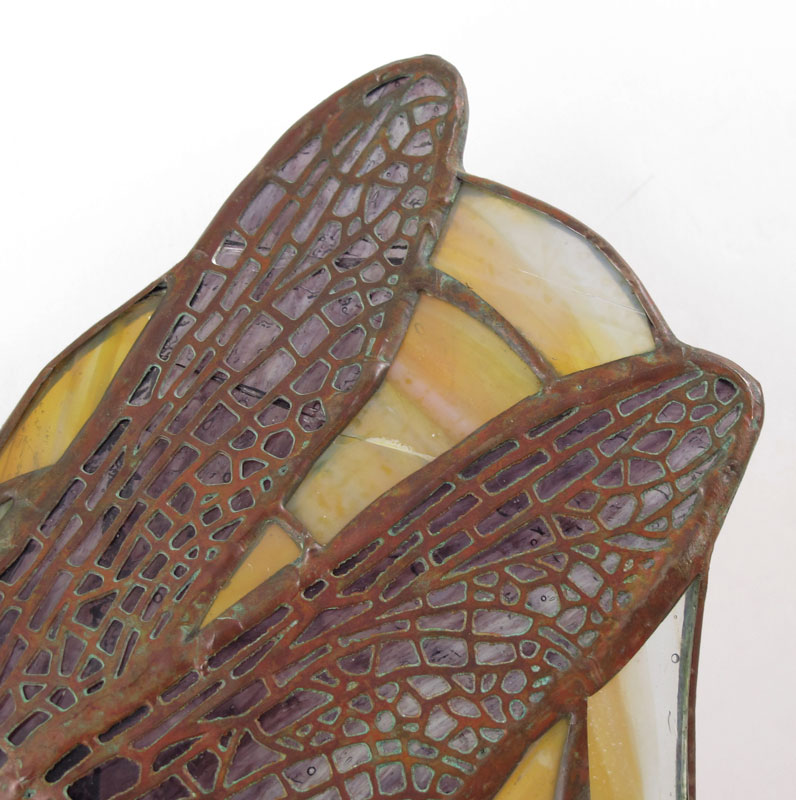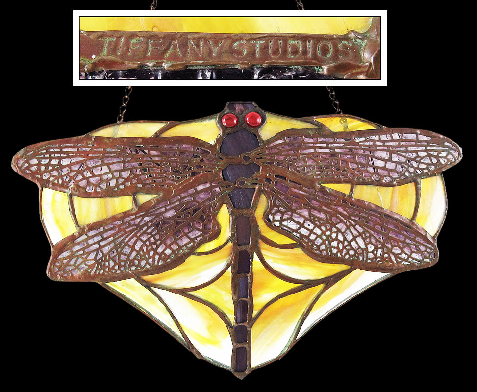 IN THE MANNER OF TIFFANY STUDIOS DRAGONFLY LAMP PENDANT: In the manner of Tiffany Studios with spurious Tiffany Studios mark, these pendants were hung from a hook inside Tiffany lamp shades to block the bare light from under the shade. Measures 6'' h. x 10''.