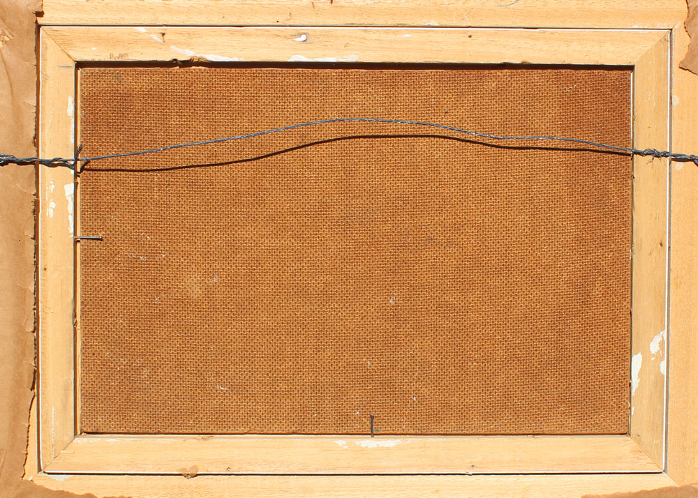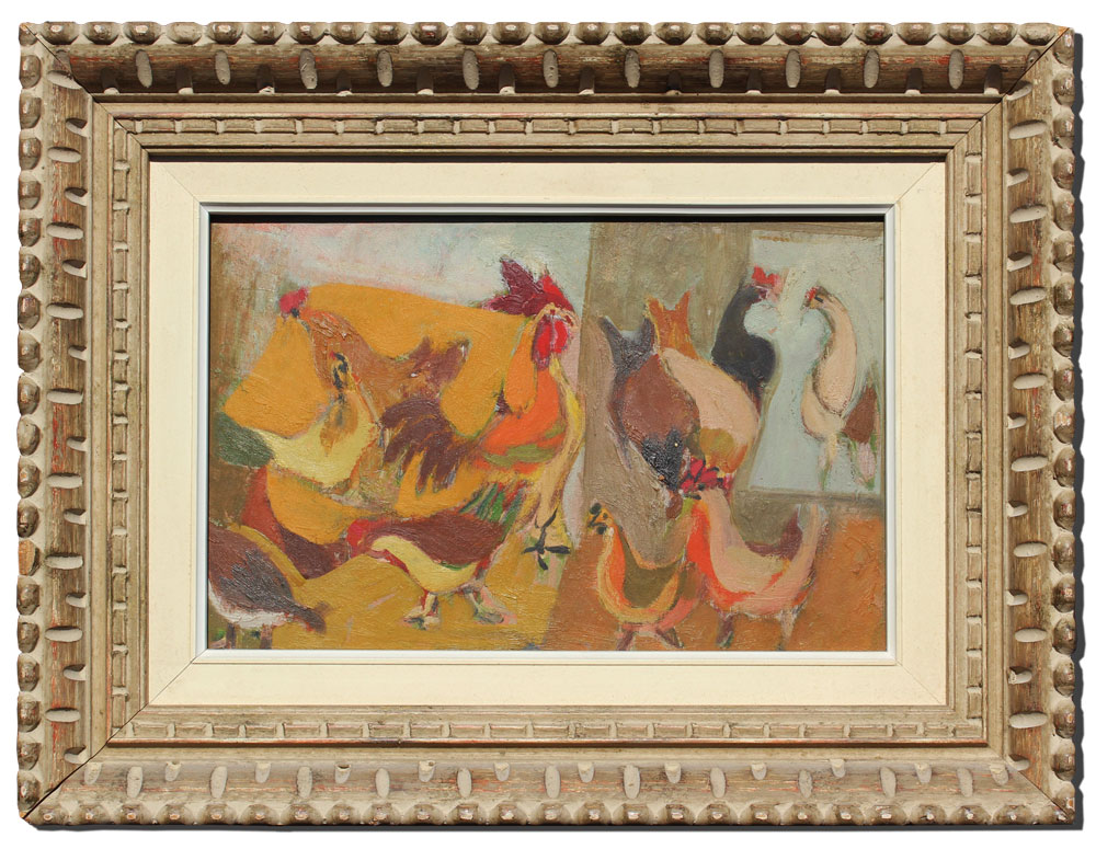 MODERNIST OIL ON MASONITE BARNYARD SCENE WITH HENS AND ROOSTER: Possibly by John W. Fisher, 8'' x 12'', no visible signature, framed, 13'' x 17''.