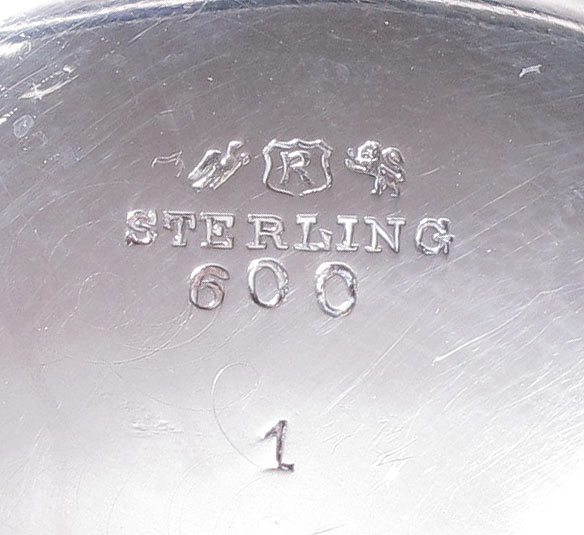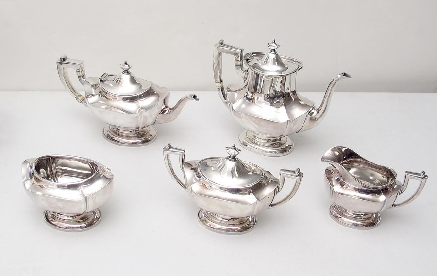 5 PIECE REED AND BARTON STERLING TEA SERVICE: Pattern number 600 to include 1) Coffee pot with hinged lid, 8'' h. x 9 1/2''. 2) Tea pot with hinged lid, note hinge has separated from base, 6'' h. x 10 3/4''. 3) Covered sugar, 5 1/4'' h. x 8 7/8''. 4) Open creamer, 4 1/4'' h. x 6''. 5) Open waste bowl, 3 1/2'' h. x 5 1/2''. Approx. 63.3 troy oz.