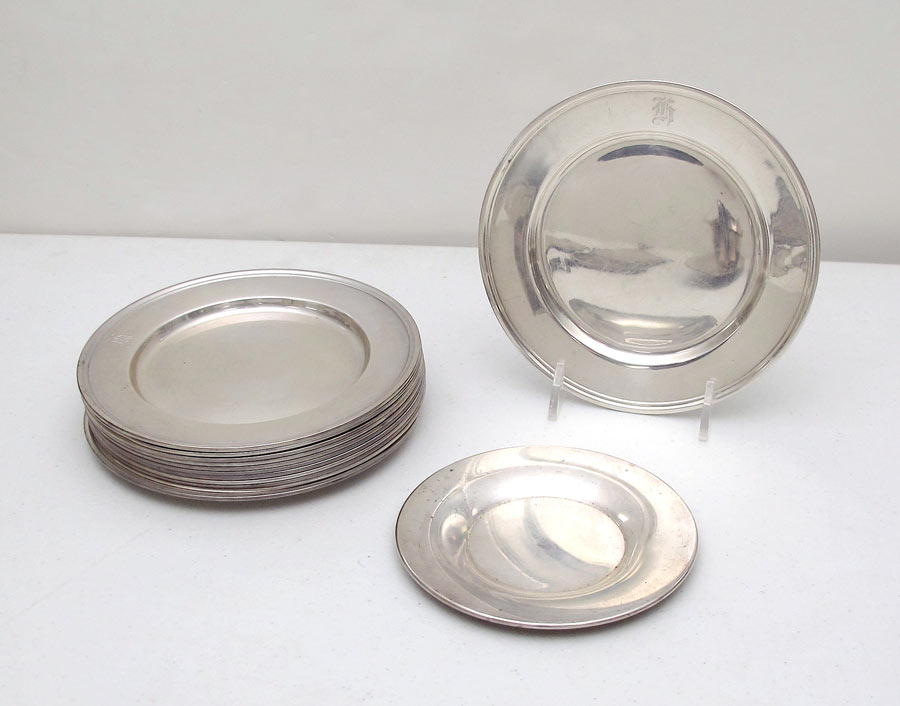 12 ALVIN STERLING BREAD PLATES: Monogrammed. 5 3/4'' dia. Sold with an additional Lunt Sterling dish, 4 5/8''. Approx. 28.6 troy oz. total.