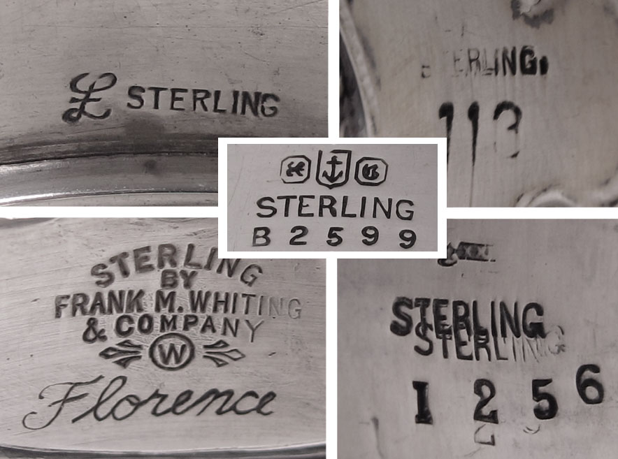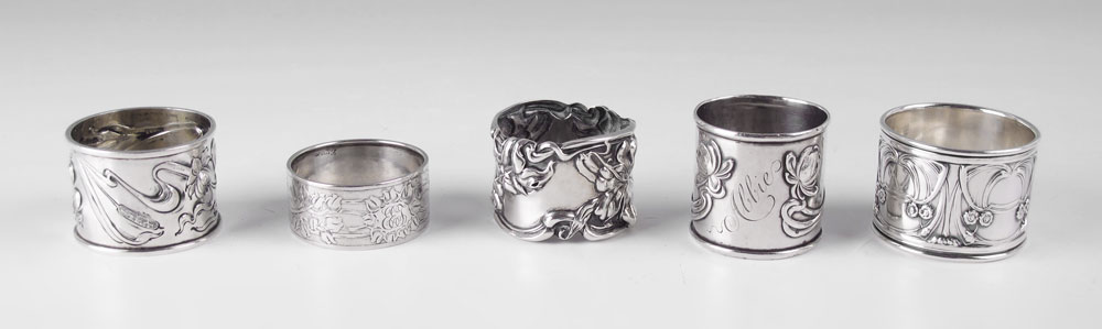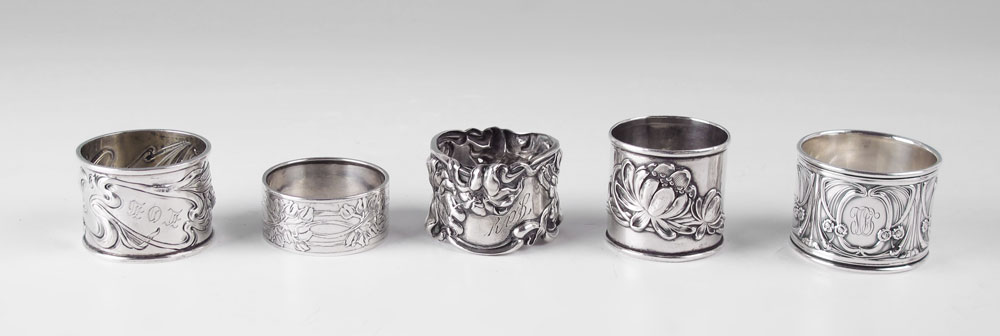 5 PIECE COLLECTION ART NOUVEAU STERLING NAPKIN RINGS: An assembled collection to include Gorham, Kerr, Whiting, LaPierre, and one illegibly stamped. All monogrammed. Approx. 4.8 troy oz.