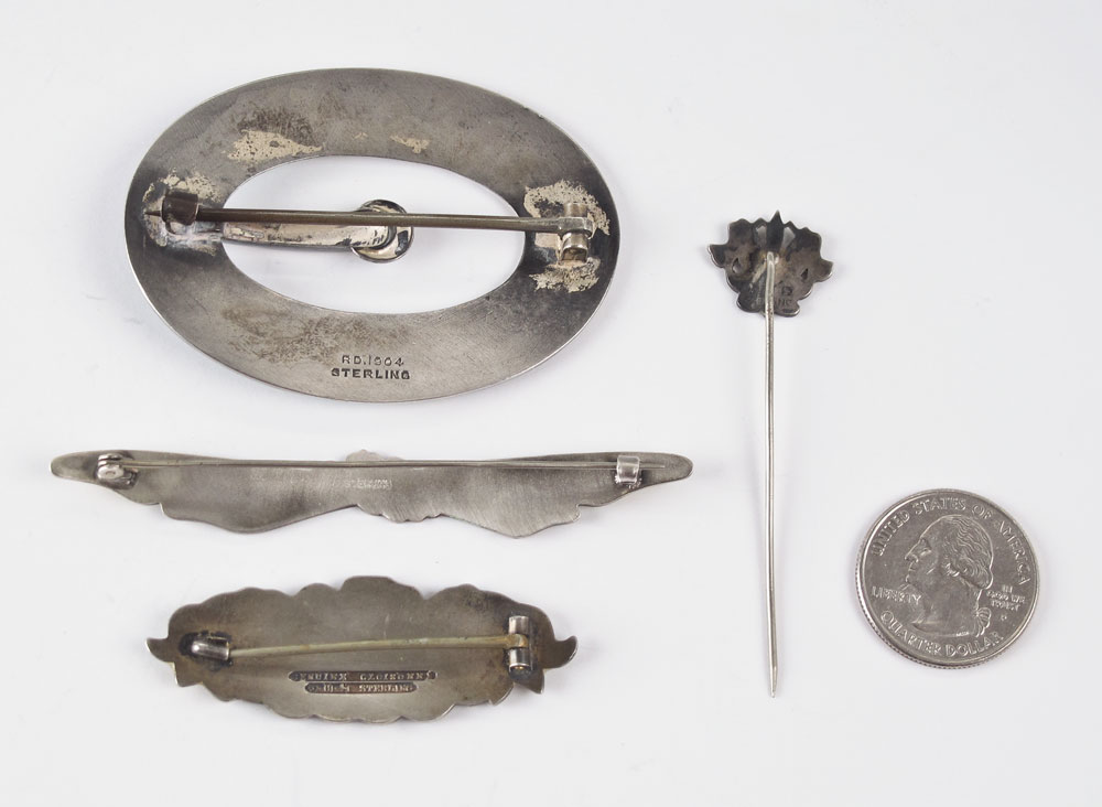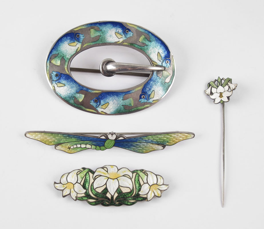 4 ENAMELED STERLING ART NOUVEAU PINS: To include 1) Oval pin with figural angelfish, marked RD 1904, Sterling, 2 1/2'' x 1 3/4''. 2) Dragonfly, marked Sterling, 3 3/8''. 3) Watson Co. floral pin, marked Genuine Cloisonne, Wallace mark, Sterling, 2 1/4''. 4) Floral stick pin with unknown makers mark, 2 3/4''.