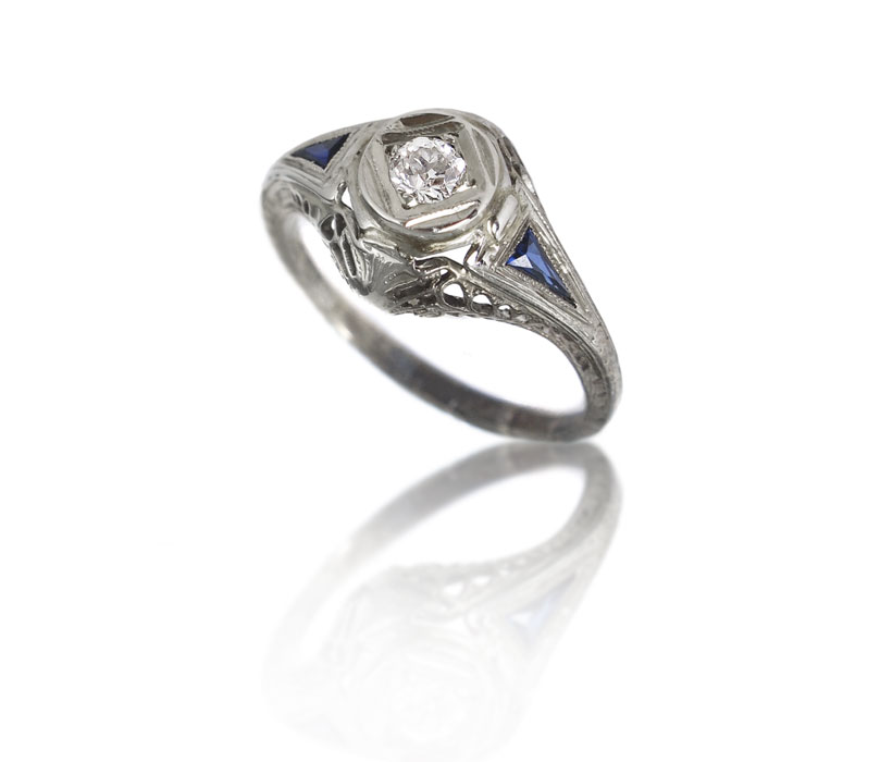 18K DECO FILIGREE DIAMOND RING: 18K white gold filigree ring contains centers one old European round cut diamond. Weight: .15 Ct. Approx. Rated VS in clarity and H-I in color. Two triangle cut synthetic sapphires. The diamond is prong set. The sapphires are bezel set. Weight: 2.6 grams. Size: 7