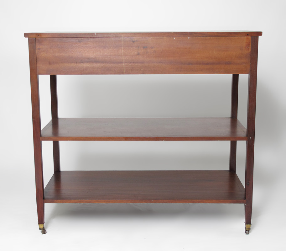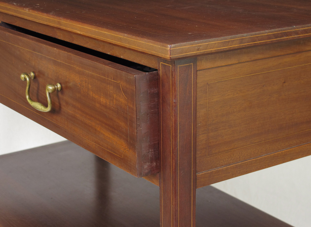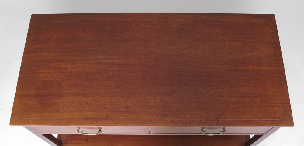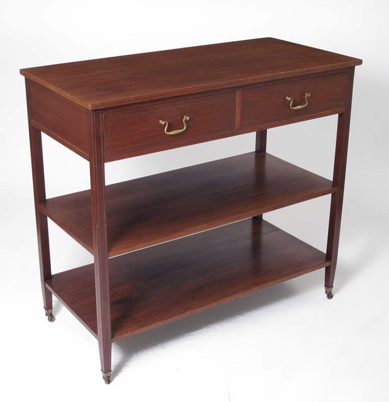 THREE TIER STRING INLAY MAHOGANY SERVER: 2 drawers over 2 open shelves, string inlay, casters. 38 1/4'' h. x 42 1/4'' x 20 1/4''.