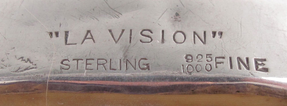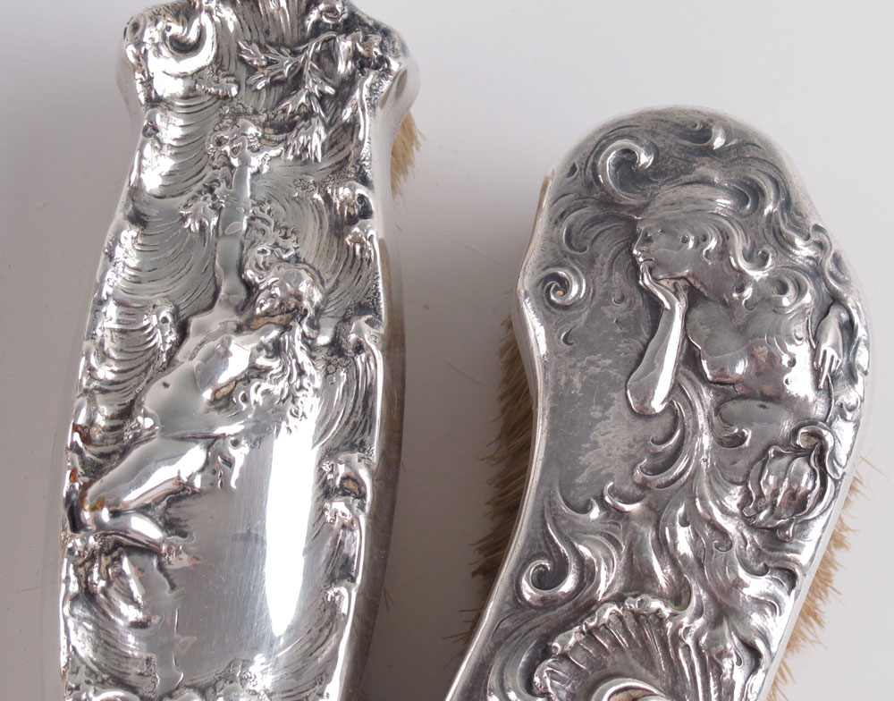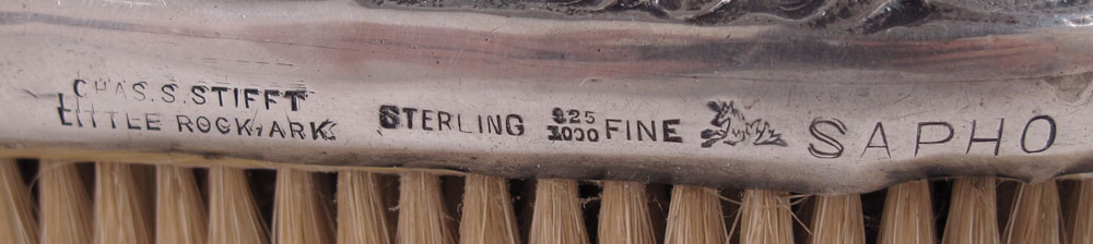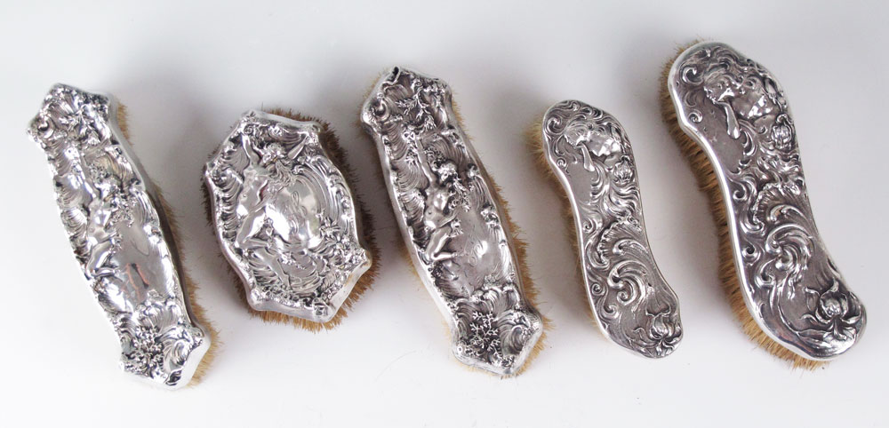 5 MAUSER STERLING MOUNTED BRUSHES: To include 1) 3 brushes in the ''La Vision'' pattern, 2 cloth, 1 military. 2 monogrammed with Mauser markings, other simply marked Sterling. 2) 2 cloth brushes marked with Mauser markings, ''SAPHO'', one with retailers name as well. Largest brush measures 2 1/4'' h. x 7 3/4'' x 2 1/2''.