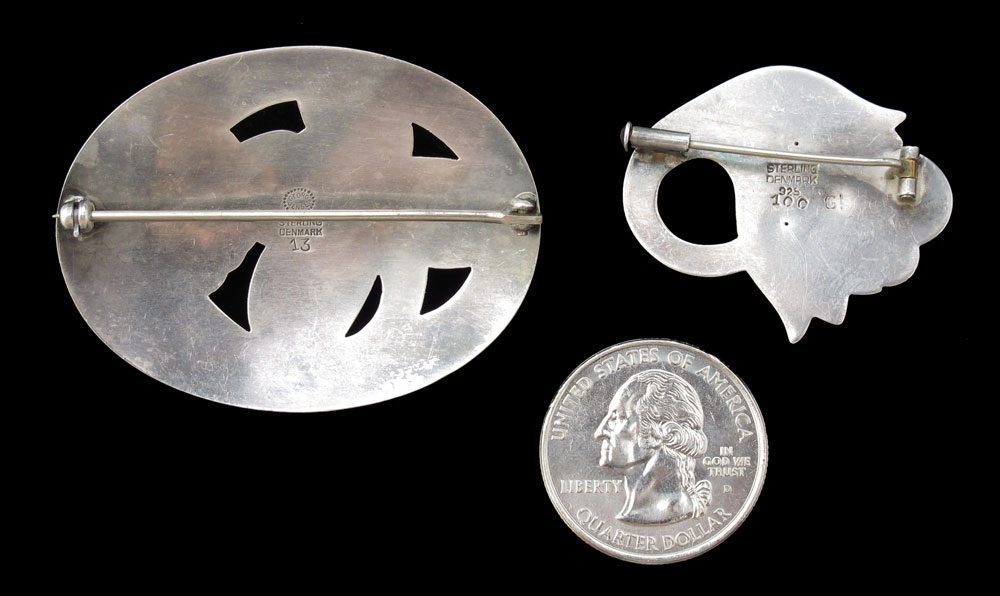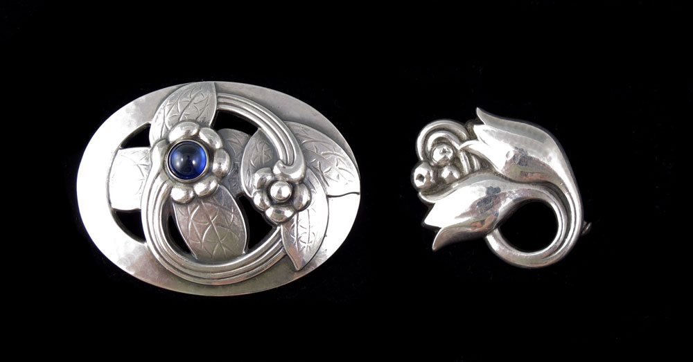 2 GEORG JENSEN BROOCHES / PINS: To include 1) Floral design, pattern 100, marked Sterling, Denmark, 925, 100, GI. 1 3/8'' x 1''. 2) Floral design with blue cabochon, pattern 13, marked with post 1945 Jensen mark, Sterling, Denmark, 13. 2'' x 1 1/2''.
