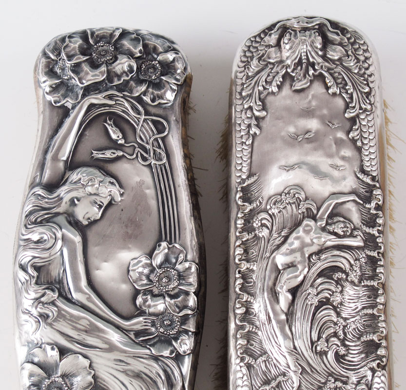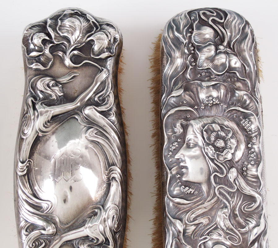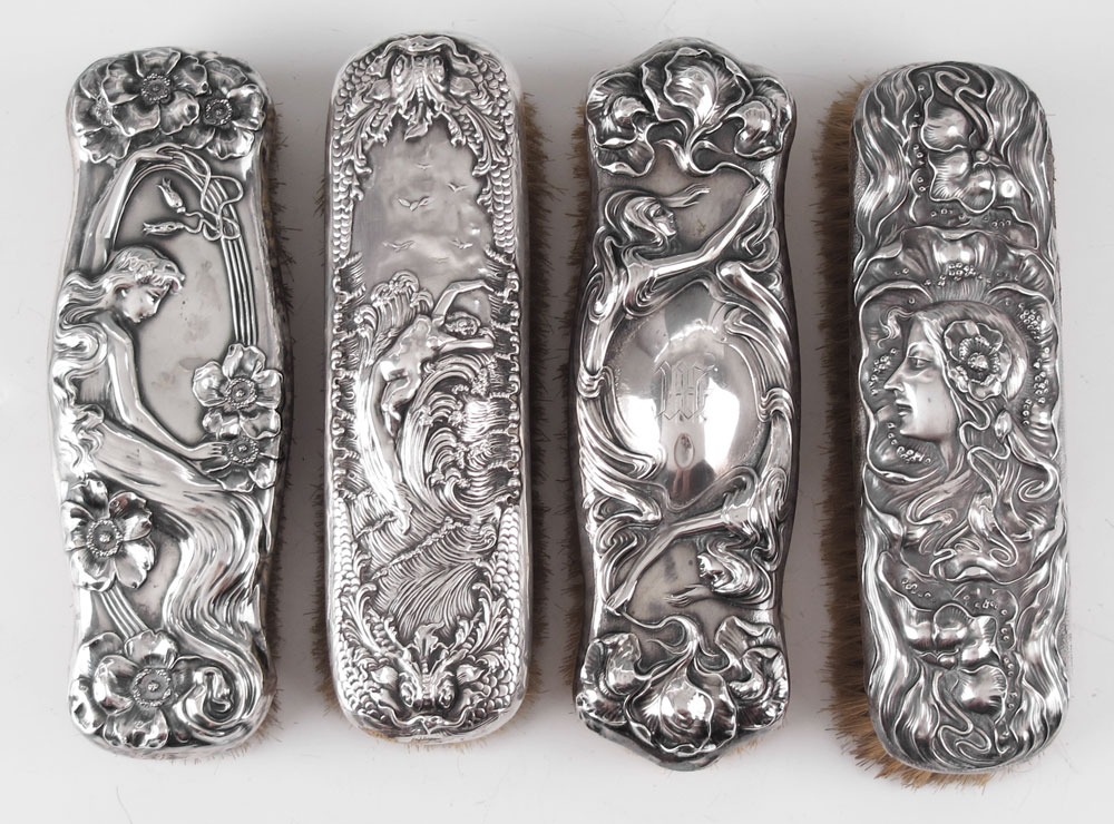 4 UNGER BROTHERS STERLING CLOTH BRUSHES: One of each of the following patterns, Dawn, Reine de Fleurs, Le Secrete des Fleurs, and Bride of the Wave. One monogrammed. Each approx. 7'' x 2''.