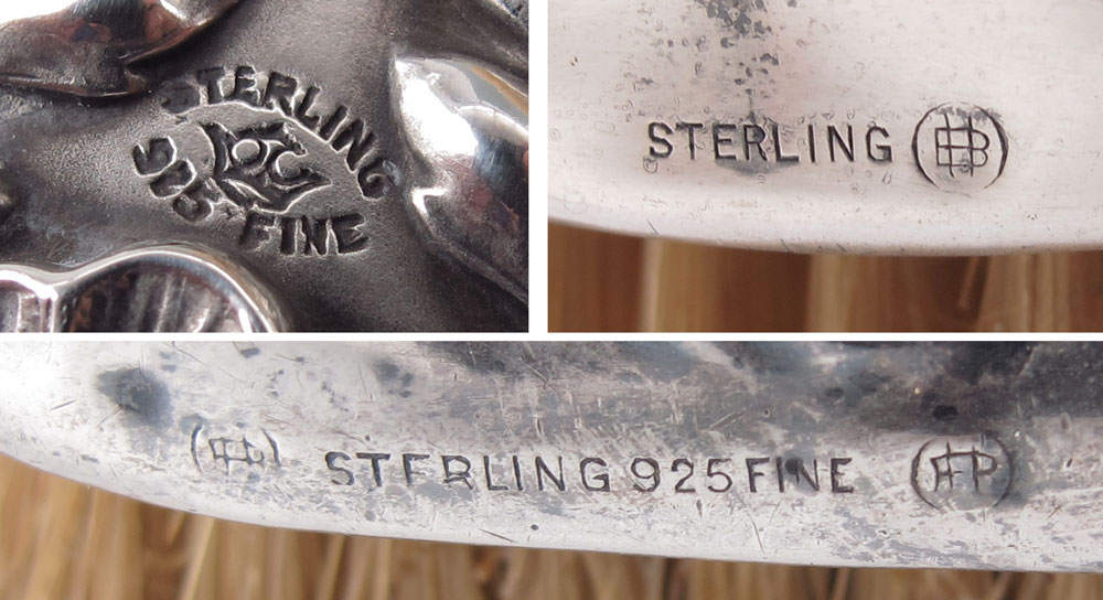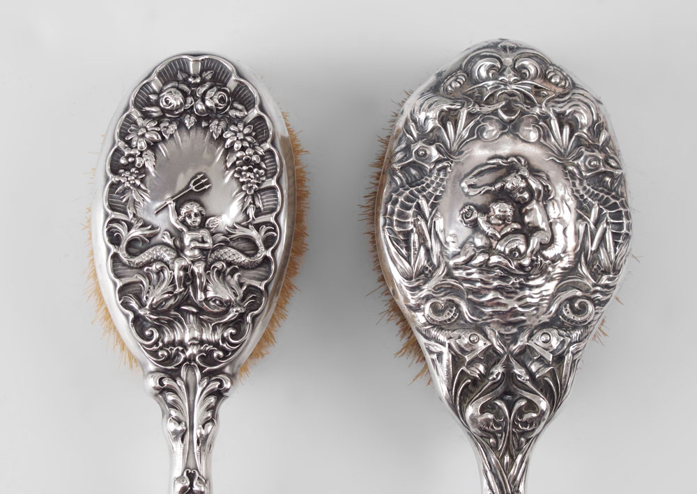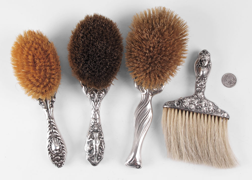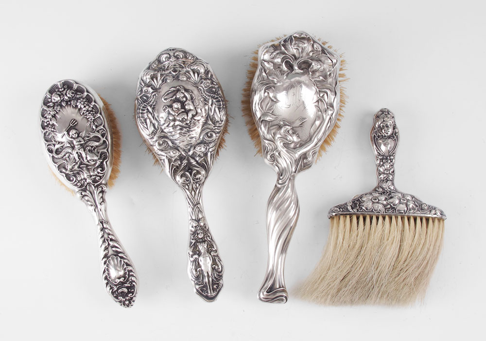 COLLECTION OF 4 STERLING MOUNTED HAIR BRUSHES: To include 1) Unger Brothers ''Loves Voyage'' hair brush, 9'' l. 2) Unger Brothers ''Secret of the Flowers'' hair brush, monogrammed, 9 1/2'' l. 3) Unger Brothers ''Evangeline'' bonnet brush, 7'' l. overall. 4) John Reddall & Co. hair brush with cupid holding a trident, 8 1/2'' l.