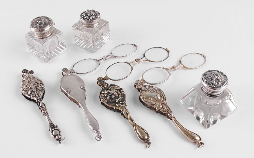 CONDITION: Note condition issues to lorgnettes and inkwells, please call for condition.