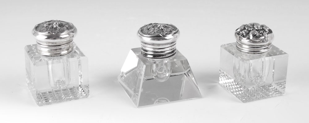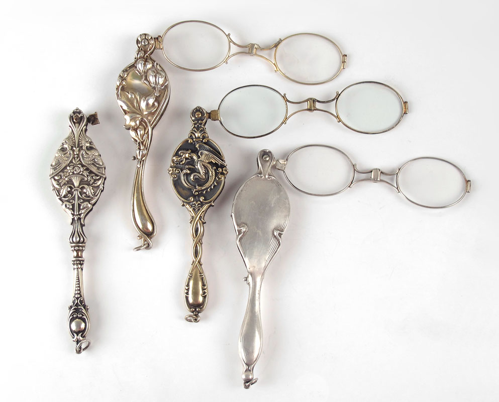 4 ART NOUVEAU STERLING LORGNETTES & MOUNTED INKWELLS: To include 4 lorngettes by assorted makers and 3 sterling mounted cut glass inkwells. All in typical art nouveau motifs. Largest lorgnette 5''.