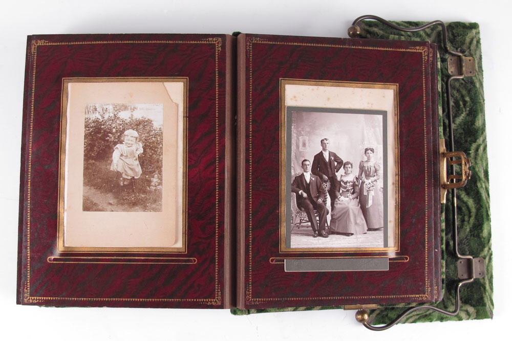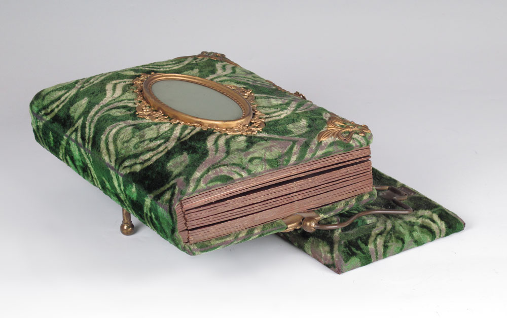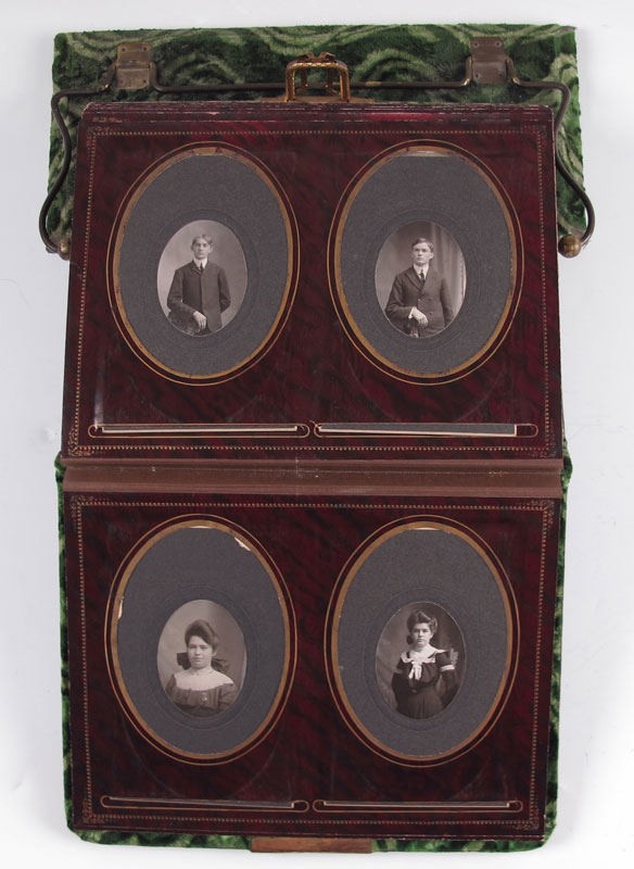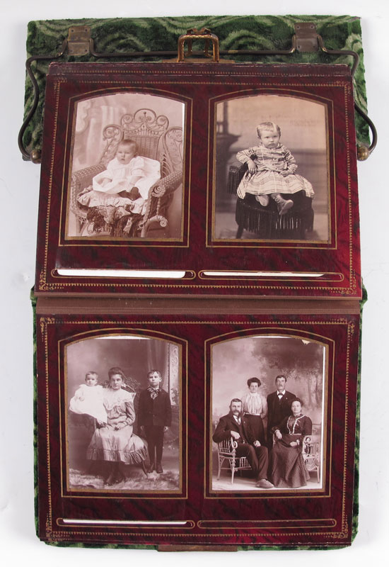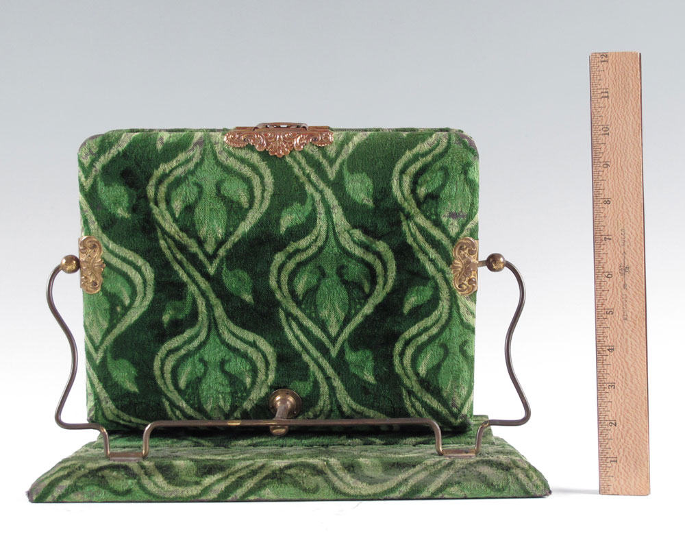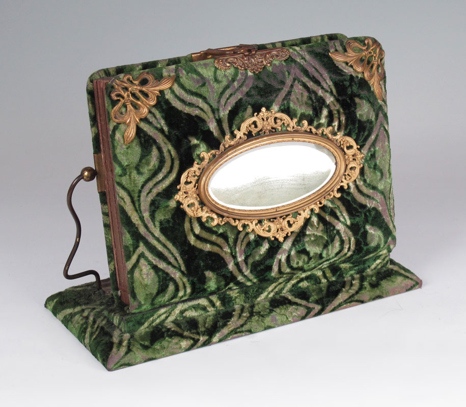 VICTORIAN PHOTO ALBUM WITH STAND: Floral motif felt tone on tone upholstered book and stand, 17 pages. Gilt decorated metal mounts and mirror. Album is filled with photos and cabinet cards. Measures 5 3/4'' h. x 14'' x 13 1/2''.