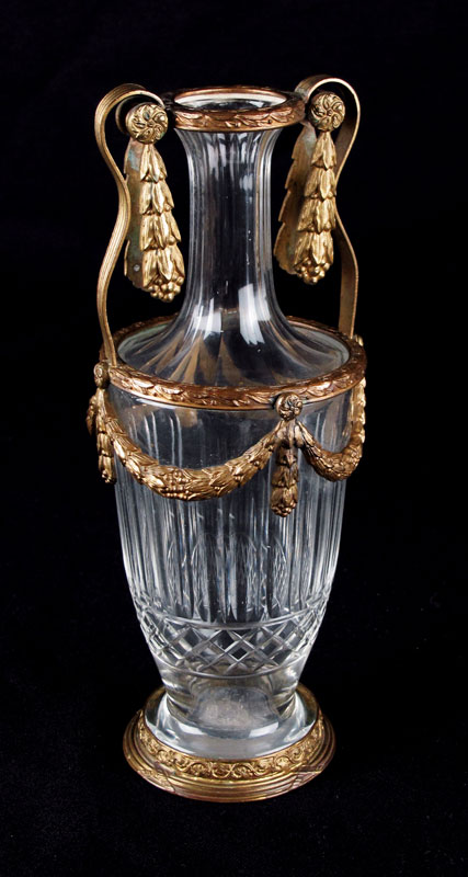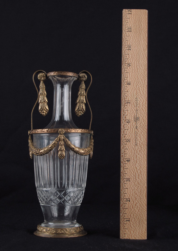 BACCARAT QUALITY GILT BRONZE MOUNTED VASE: Unsigned but of Baccarat quality, gilt bronze mounted with garland designs. Measures 8 3/4'' h. x 3 1/2''.