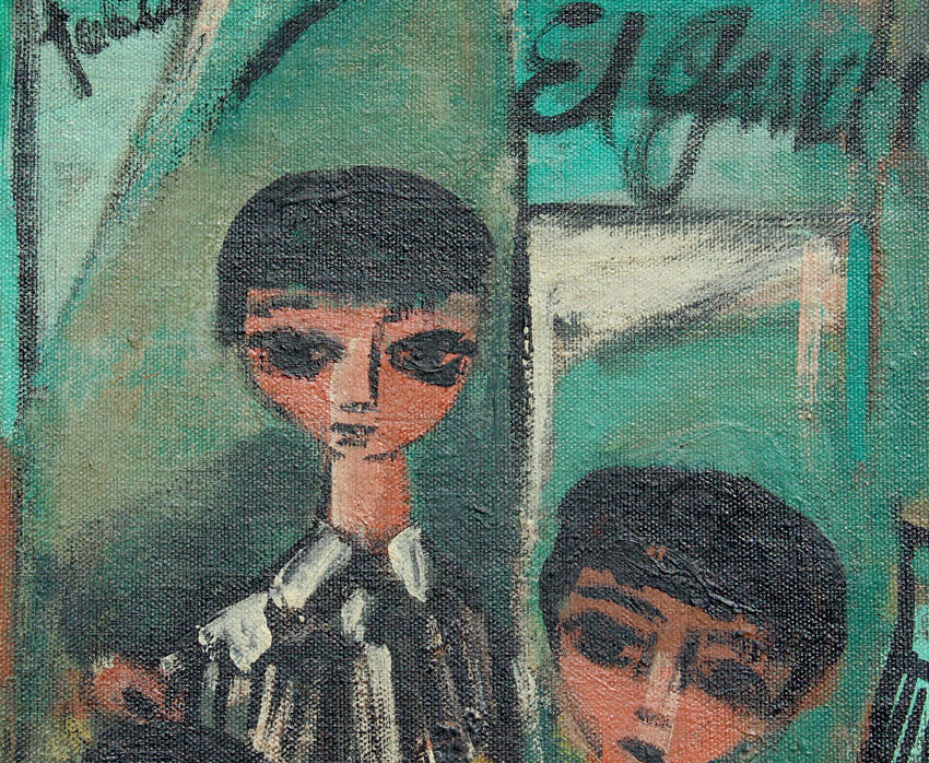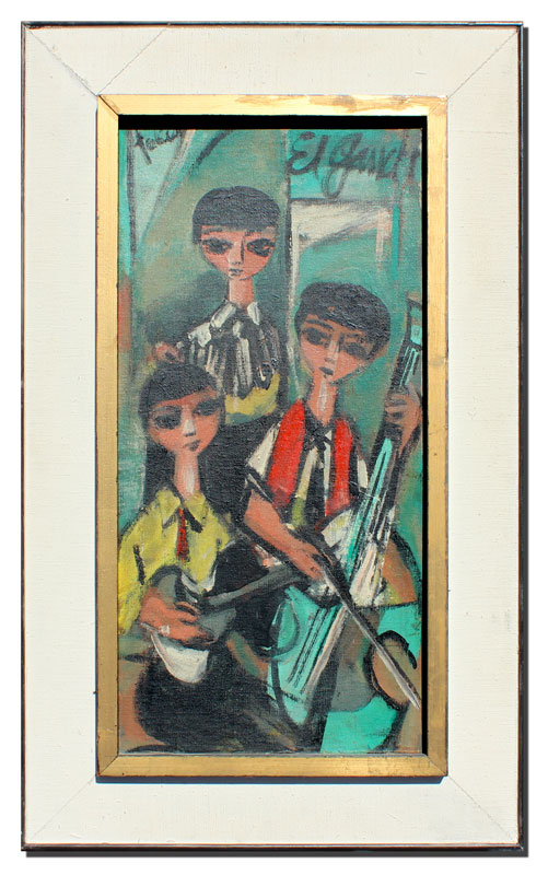 TAKIS, Nicholas, (American, 1903-1964): ''El Gauchos'', Three Musicians in an Interior, Oil/Canvasboard, 18'' x 9'', signed upper left, titled upper right, original frame, 23 1/2'' x 14 1/4''.