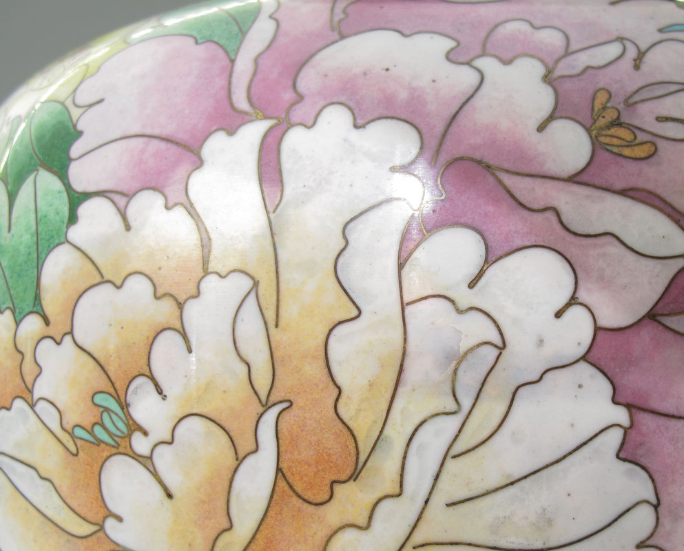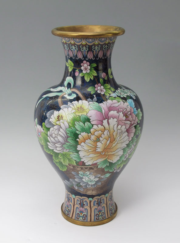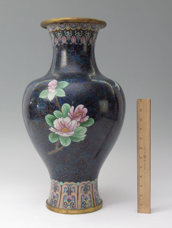 CHINESE 20.5'' TALL CLOISONNE: Floral design on black and blue ground. Brass. Approx. 20.5'' tall x 12'' at the widest.