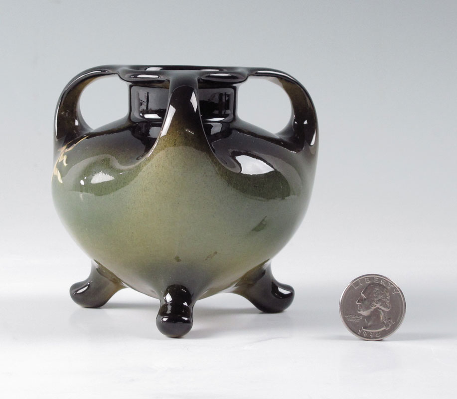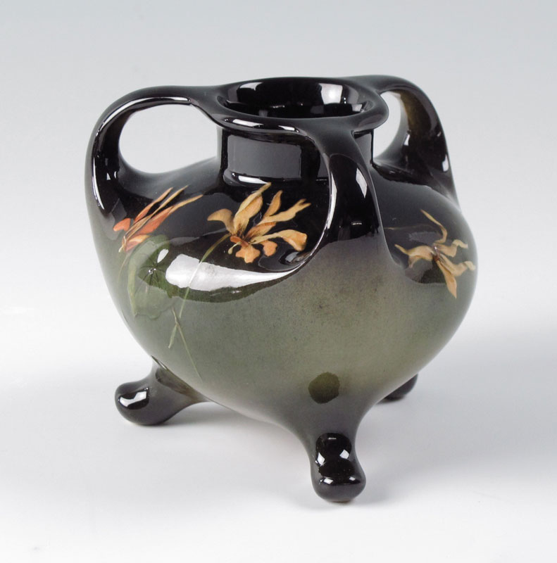 WELLER LONHUDA TRI FOOT HANDLED VASE: Painted with iris flowers, impressed marks Lonhuda, 280. 3 3/4'' x 4 1/8''.