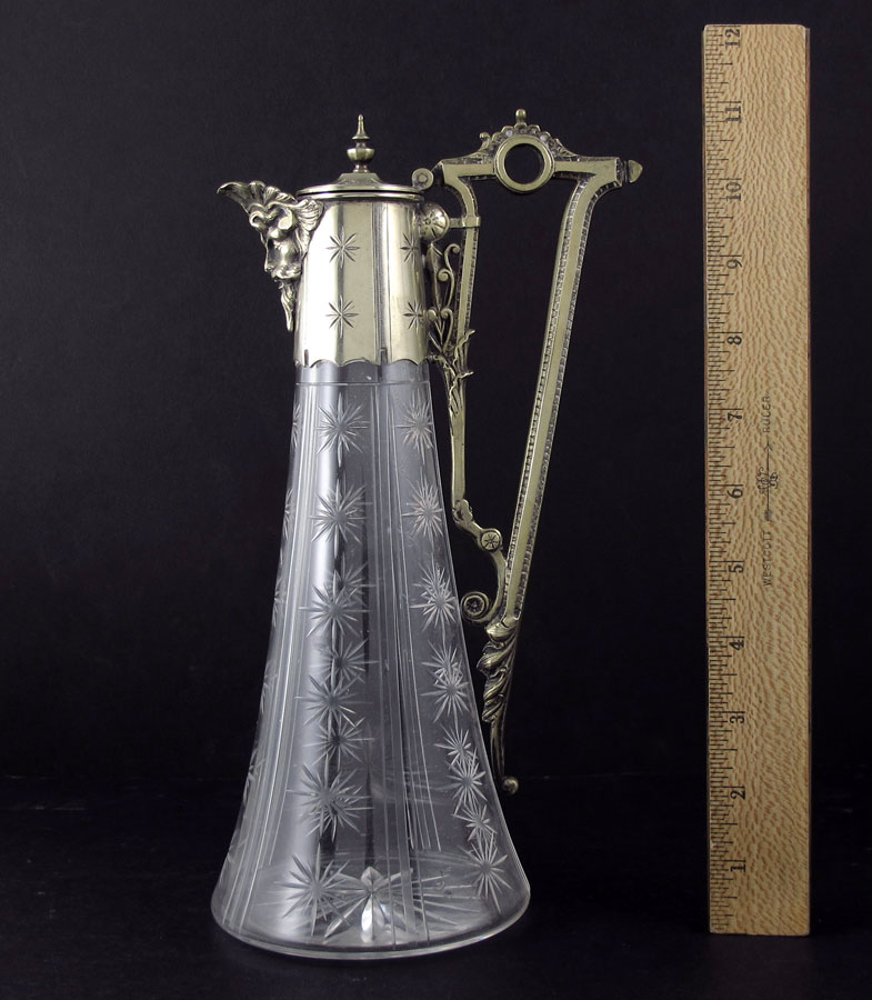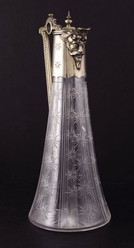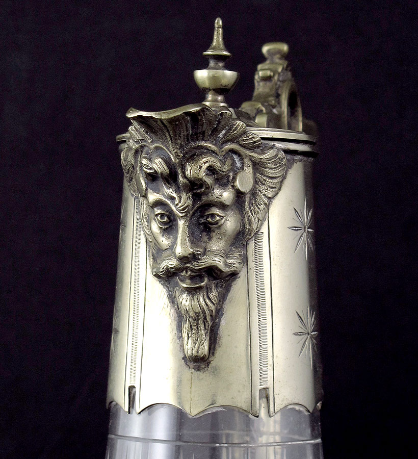 ENGLISH METAL MOUNTED CLARET JUG: Metal mounted top and handle with figural masqueron spout, traces of vermeil wash remain. Cut glass base. 11 1/8'' x 5 3/4''