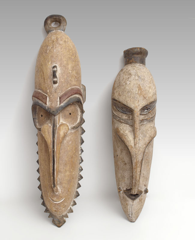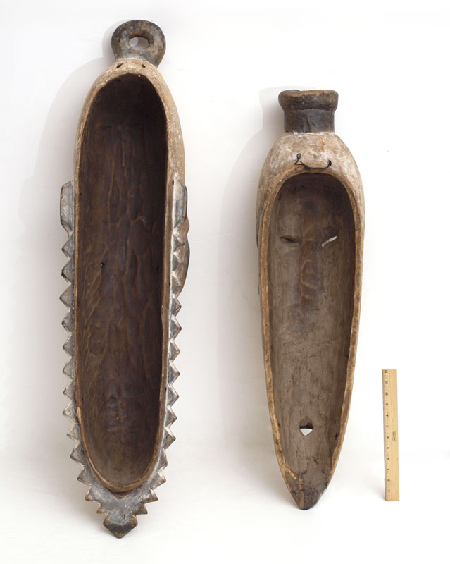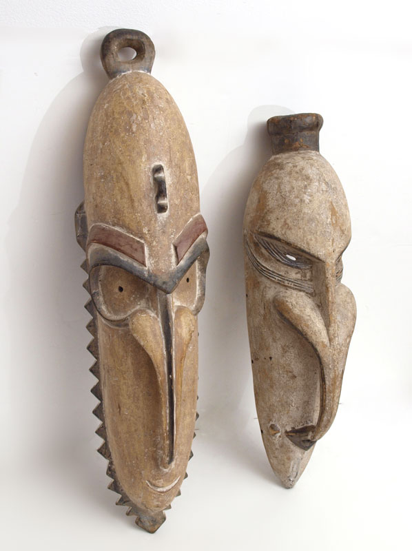 2 CARVED AFRICAN SEPIK MASKS PAPUA NEW GUINEA: 1) 43 1/2'' x 11'' x 8 1/2'', 2) 36'' x 9 1/2'' x 9''