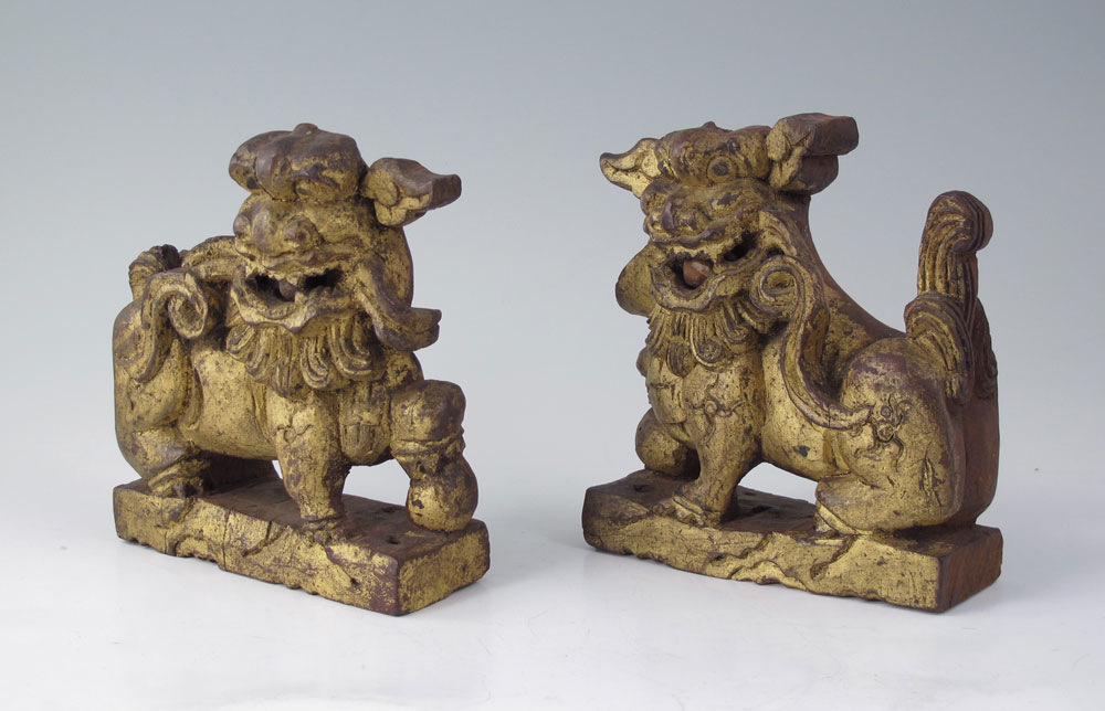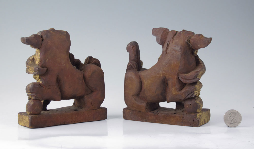 PAIR CARVED WOOD FOO DOGS: Gilt front, red stained verso. Each with a ball in his mouth. Approx. 5 1/2'' tall x 4 1/4''L. Note loss of one ear.