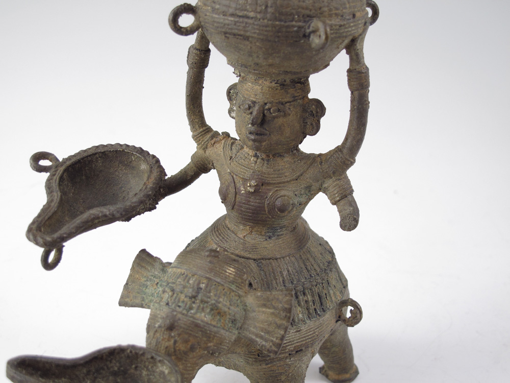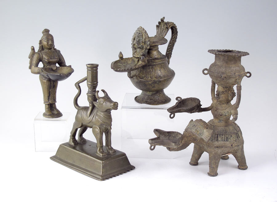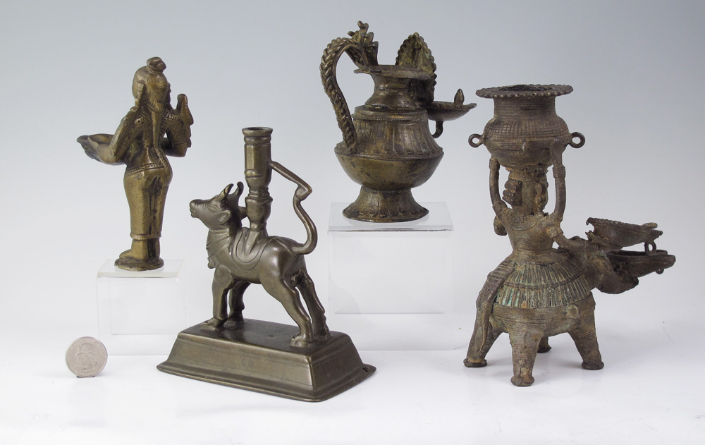 COLLECTION OF 4 BRONZE CHUEH VESSELS: Used as wine warming vessels, to include 1) Figural maiden seated on elephant, 6 1/2'' h. x 6 1/4''. 2) Figural deity with bird, 5 1/4'' h. x 3 1/4''. 3) Pitcher, 4 3/4'' x 5 1/2''. 4) Figural ox candle holder, 5 5/8'' h. x 4 5/8''. Age unknown.