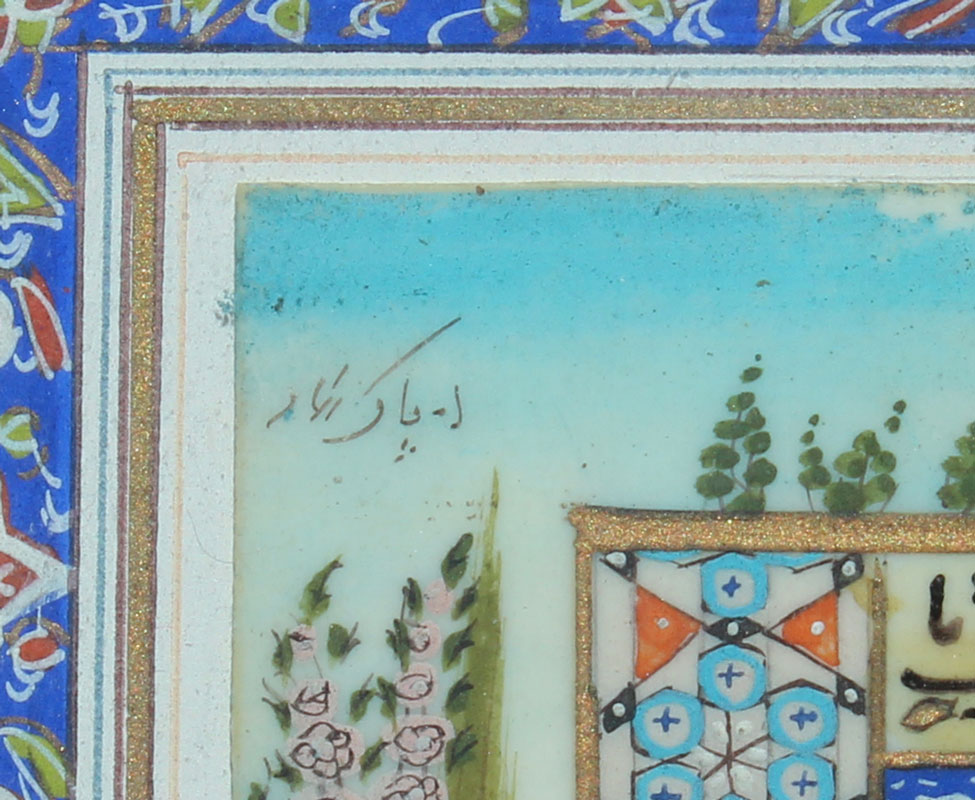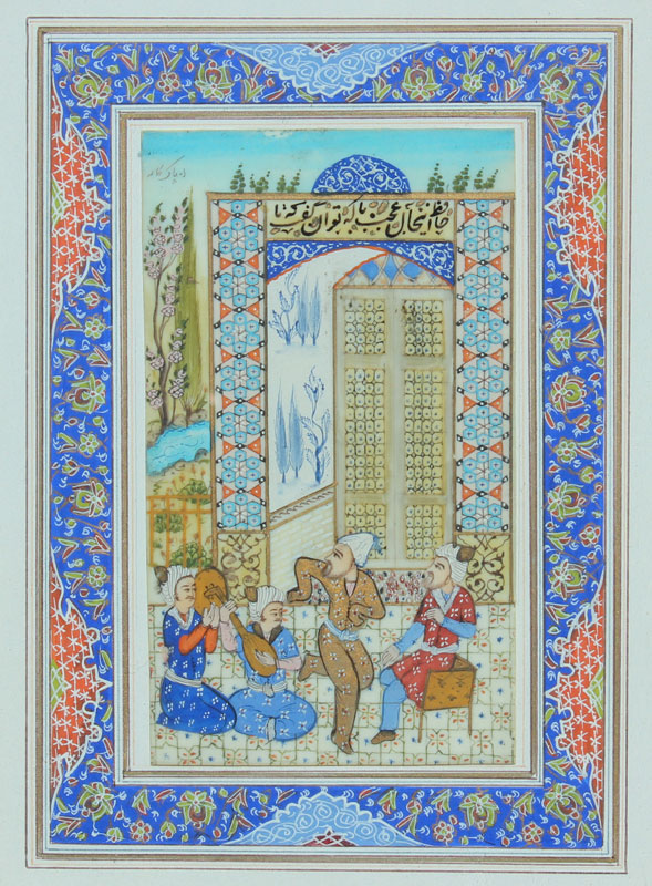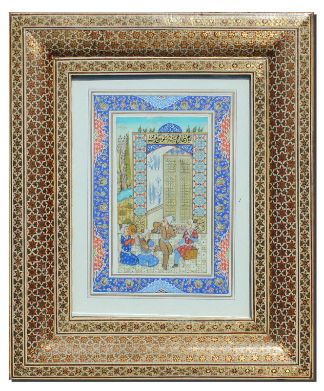 TURKISH MINIATURE PAINTING ON BONE, ORNATE INLAID FRAME: 6'' x 3 1/2'', signed upper left, hand painted mat and intricate inlaid frame (minor wear), 13 1/2'' x 11 1/2''.